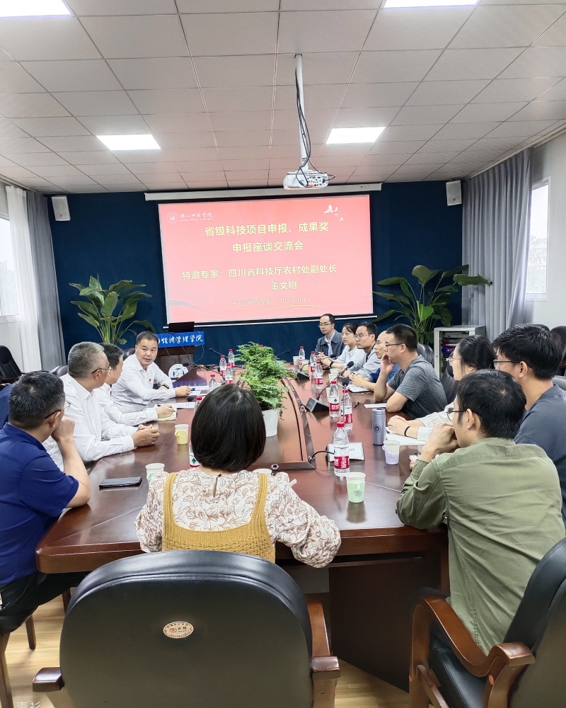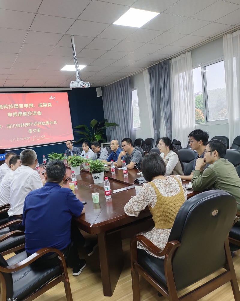 本网讯(文、图/李荣刚)2023年9月24日上午,四川省科技厅农村科技处副处长董文刚副处长一行前来我校开展“科技项目申报、成果奖申报”调研座谈会。乐山市科技局局长李志强,乐山市科技局农村科科长潘俊长及我校科研处副处长周勇,数理学院、电子信息与人工智能学院、生命科学学院等部分理工科学院教师代表参加了调研座谈会。