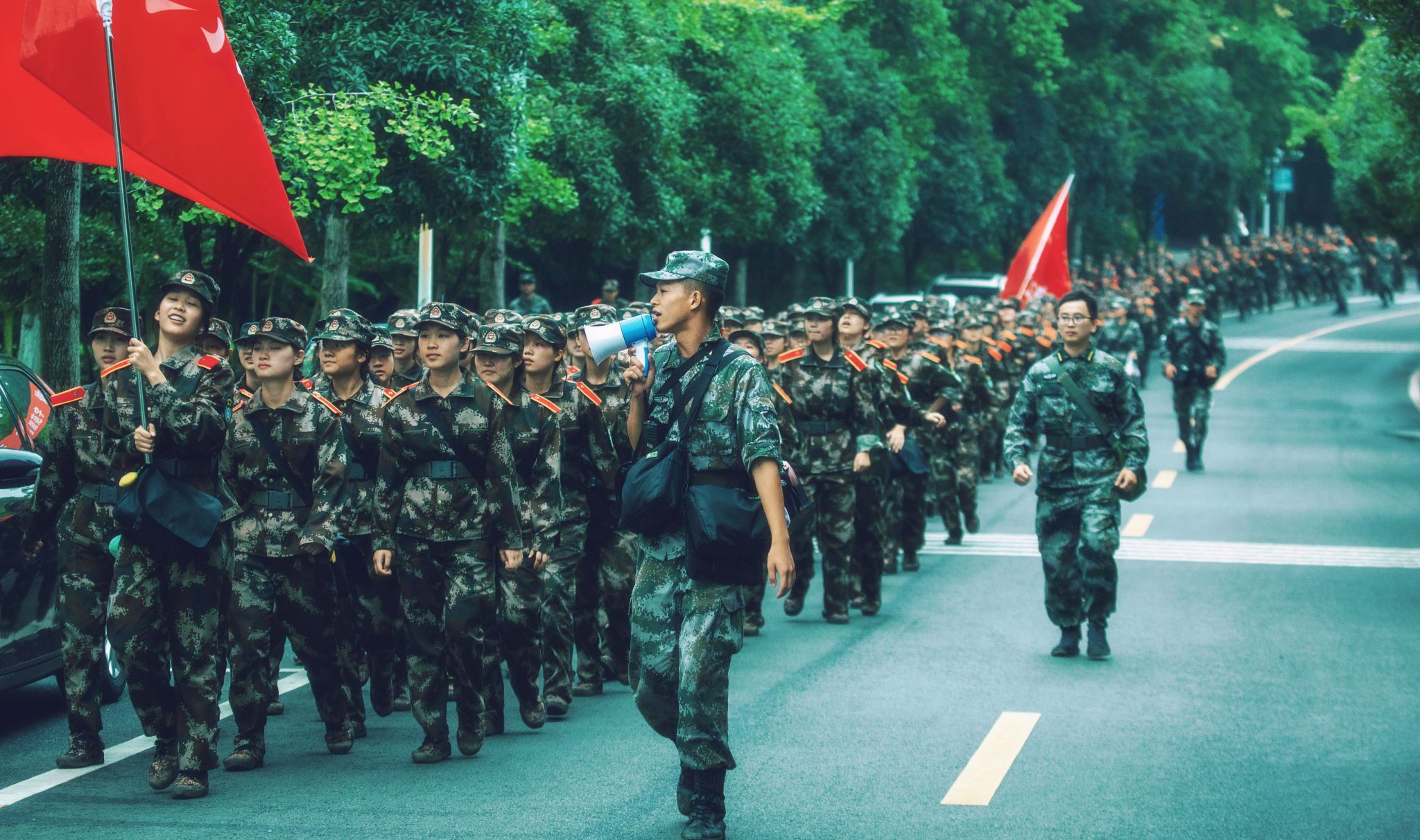 8:20,随着紧急集合号拉响,军训学员迅速抵达北校区田径场,全副武装、士气高昂、整装集结。军训团下达行军拉练命令后,全团按照先遣分队、一营、二营、团指挥中心、保障分队、三营、四营、五营的行军序列,成3路纵队向目标地域行进。行军途中,军训团组织开展了单兵战术基础动作、分队战术、战场医疗救护、核生化防护等训练科目。