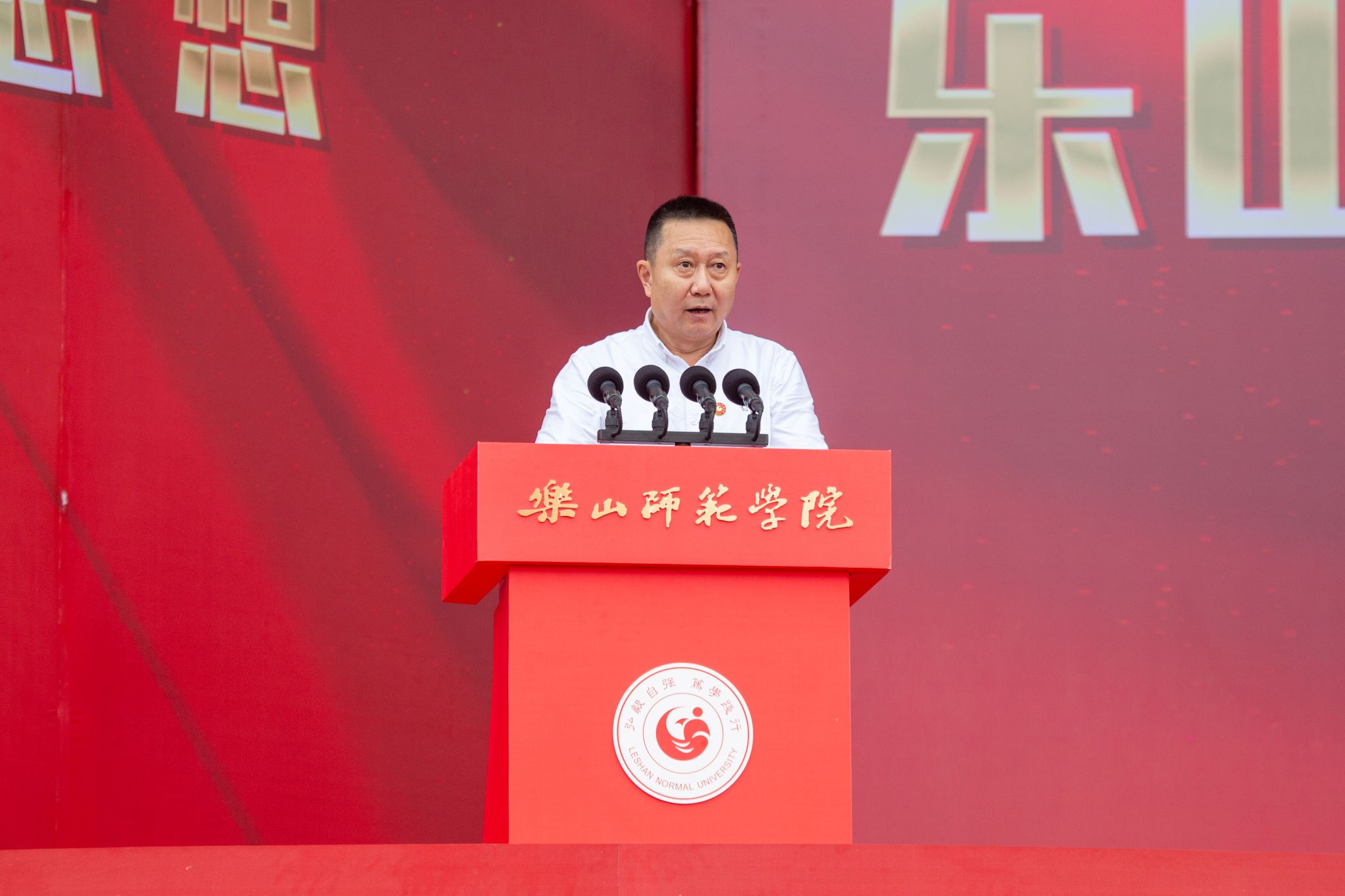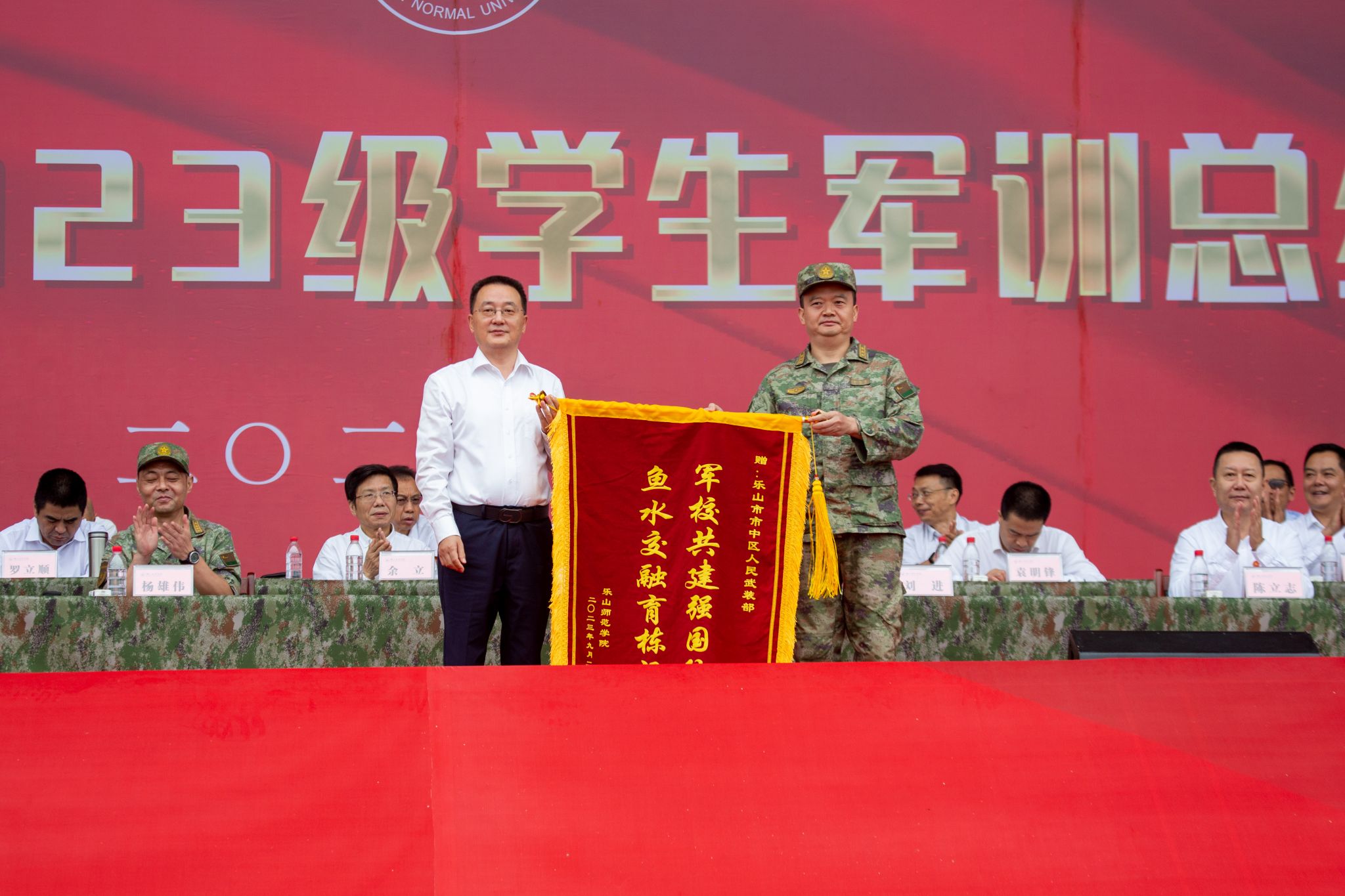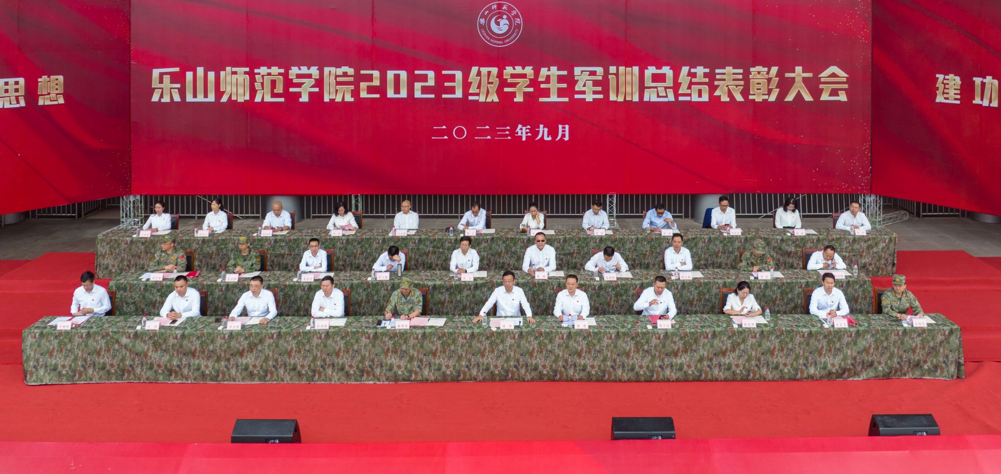 本网讯(文/宋博雯 陈虹伊 图/刘馨怡)“国无防不立,善教得民心。”为贯彻落实新时代全民国防教育,提升学校军事课教学水平和国防教育感召力,我校于9月28日在北校区田径场隆重举行2023级学生军训总结表彰大会。出席本次大会的有:学校党委书记胡丹,党委副书记、校长刘进,乐山军区大校政治委员杨雄伟,校领导陈立志,彭尚源,陈范华,李方裕,汪天飞,江滔,市中区人民武装部上校政治委员余海兵等。大会由学校党委常委、副校长李朝晖主持。
