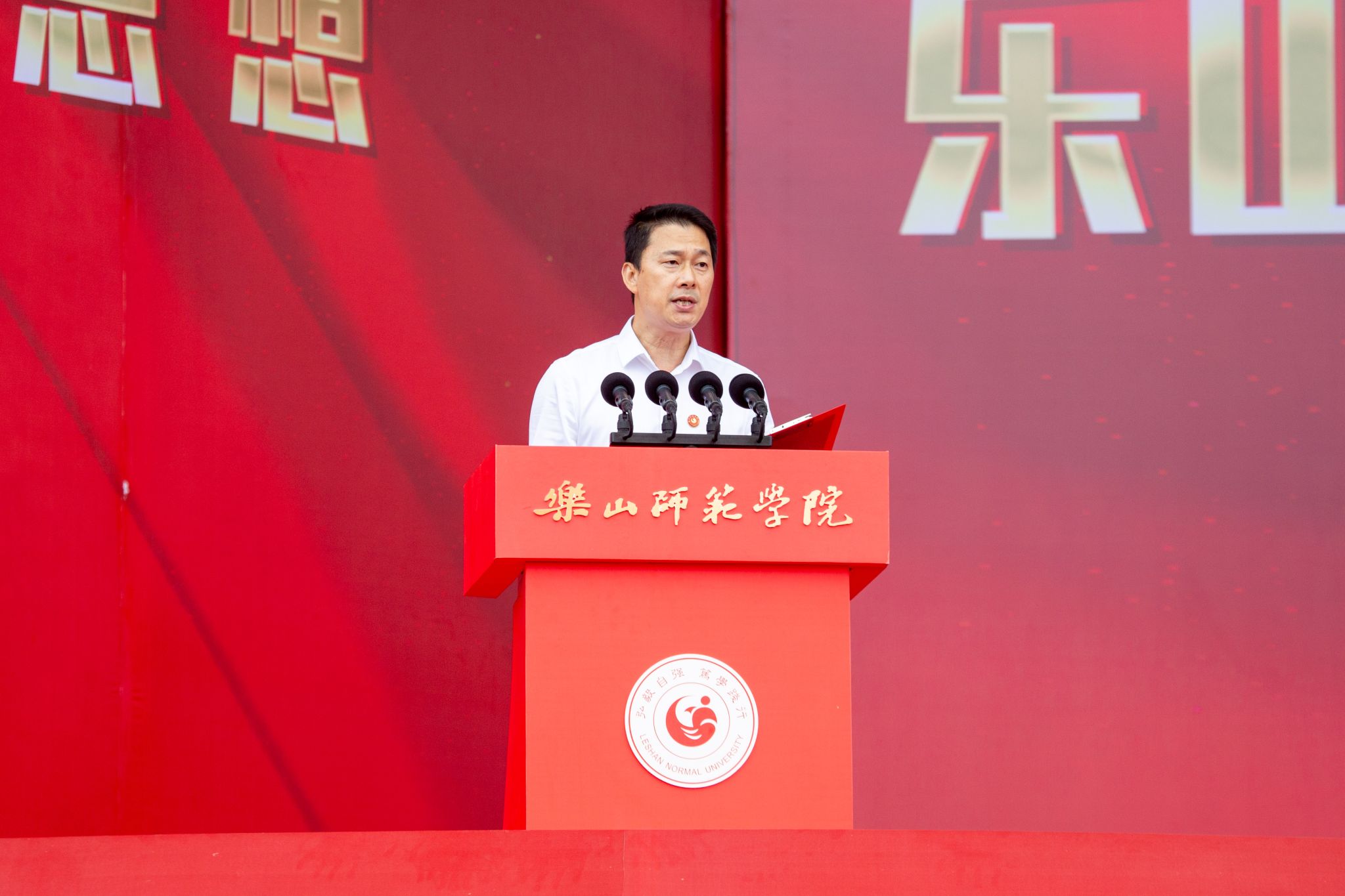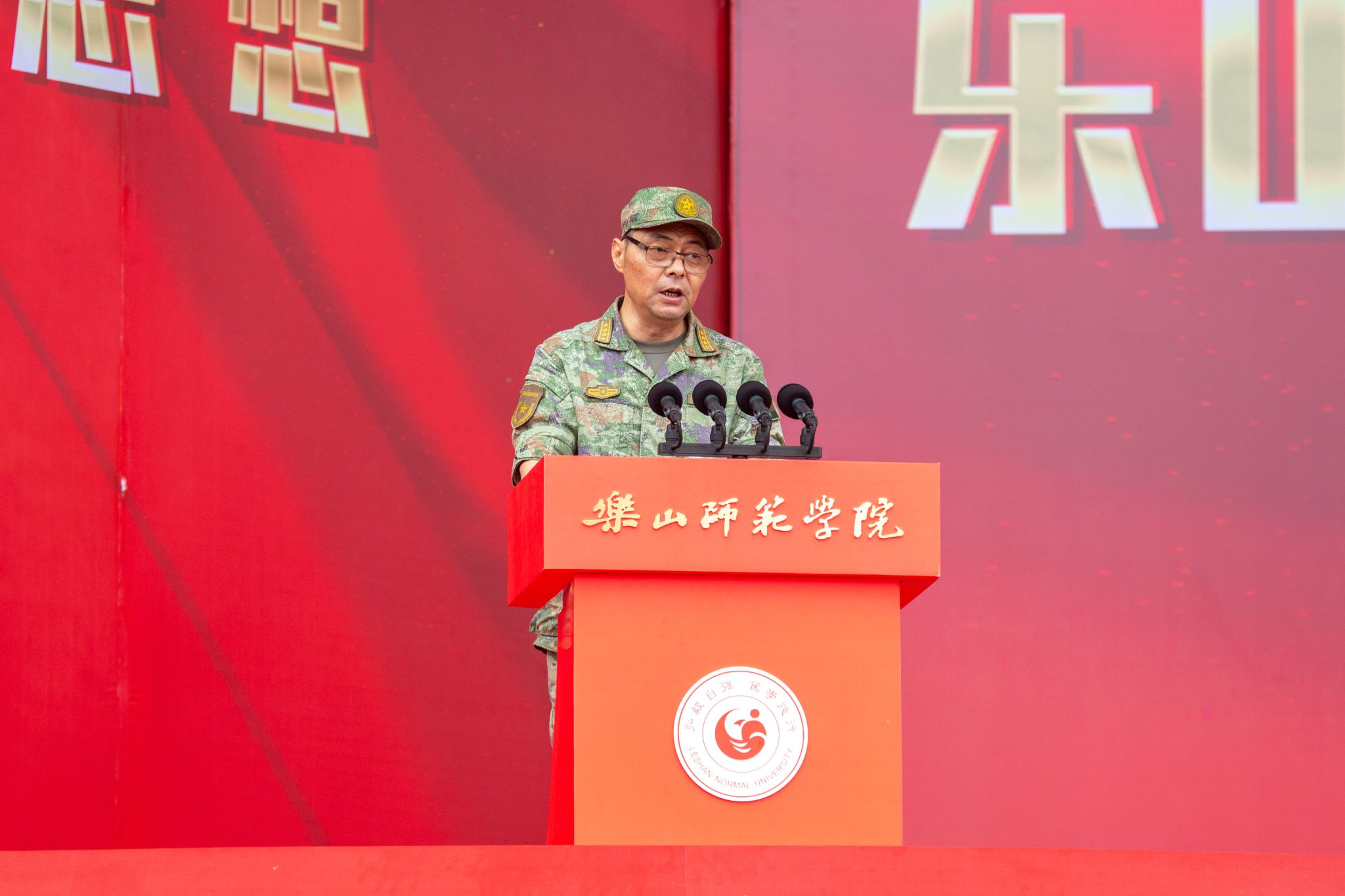 学校党委常委、副校长汪天飞作军训总结,他在总结中祝贺同学们在军训中锤炼了军事技能、勇敢精神、坚韧意志和作风纪律;感谢连日来辛勤付出的教官们发扬“退役不退志、退伍不褪色”的优良传统和作风,按照计划圆满完成训练任务;向长期以来支持我校国防教育工作的乐山军分区、乐山市市中区人民武装部首长们表示衷心的感谢。他向同学们提出了几点希望,一是希望同学们继续发扬和巩固军训成果,学习军人的勇敢与忠诚,把在军训中展现的精神风貌延续到今后的学习、工作与生活中;二是希望同学们牢记刘进校长在开学典礼上的深情寄语和谆谆教诲,勇敢面对未来的困难和挑战;三是希望同学们弘扬“敢为人先,臻于至善”的乐师精神,争做新时代的开创者、建设者和奋进者,为中华民族伟大复兴贡献青春力量!