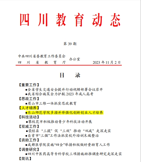 本网讯(文、图/张伊颖)四川省委教育工作委员会、四川省教育厅主办的《四川教育动态》2023年第39期,以《乐山师范学院多措并举强化创新创业人才培养》为题,专题报道了我校积极加强创新创业人才培养的具体举措。