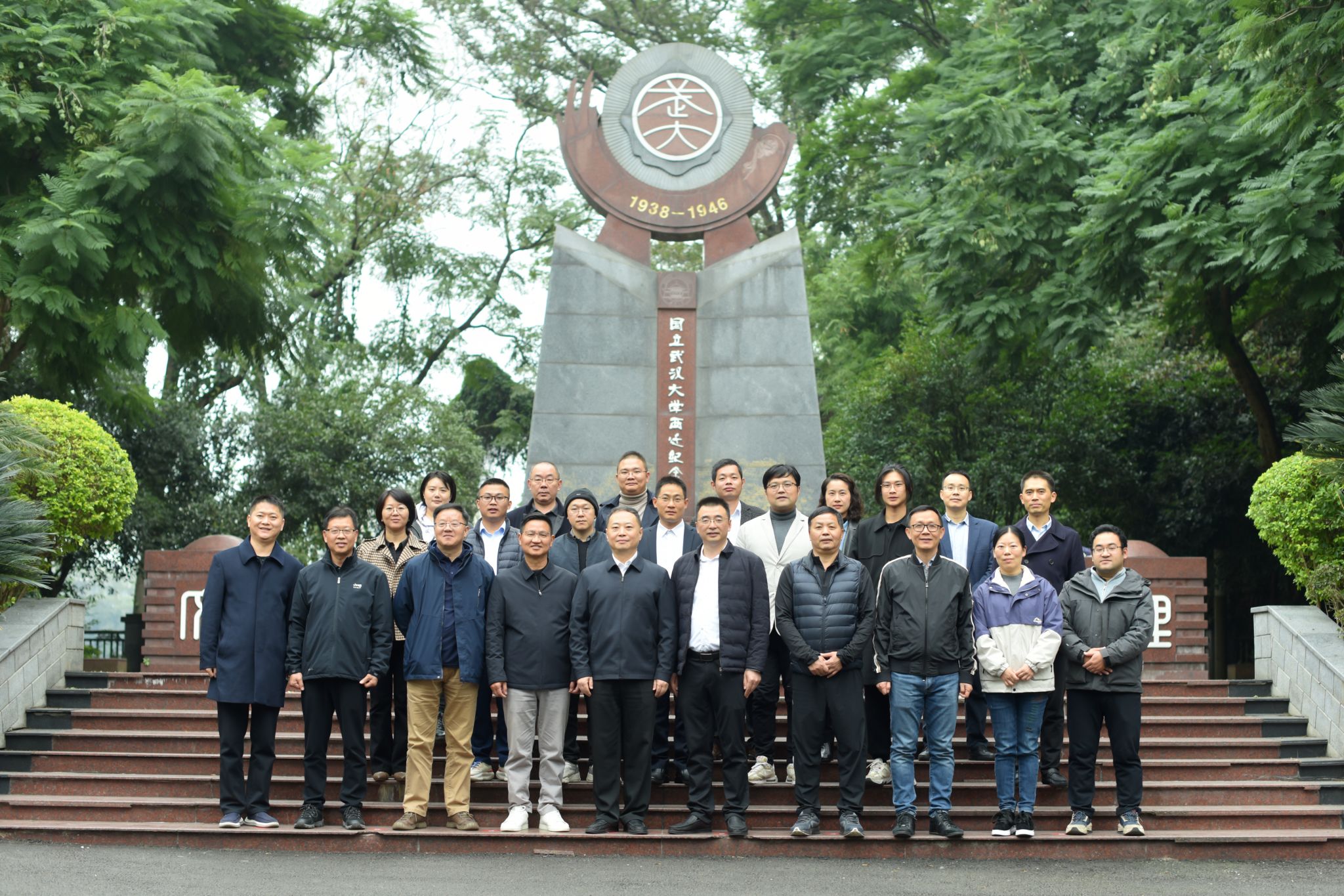 陈俚君、刘世平一行参观了武大西迁纪念碑。纪念碑主体高8米,台基长宽8米。其设计大量融入“8”的理念,旨在铭记武汉大学西迁乐山血与火的8年,苦难与辉煌并存的8年。顶端主体部分为国立武汉大学时期的校徽图案,碑身上半部分飘逸的“叶”形组成交织的双手,体现两校血脉相连的真挚友谊,也寓意武大精神在乐山得到了传承与光大。