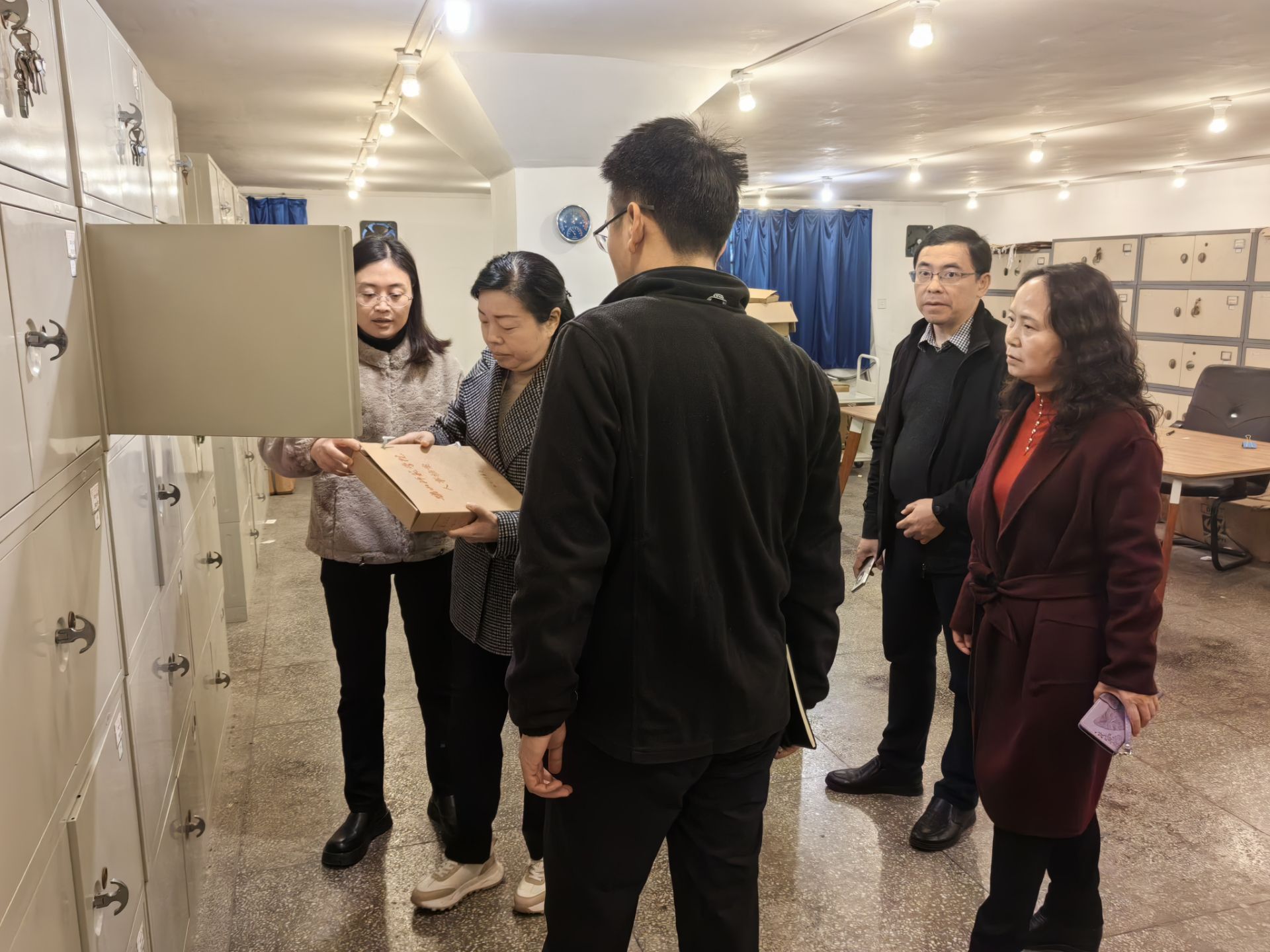 陈范华一行首先参观了档案馆库房,对我校档案资源馆藏量和馆藏分布情况、档案保存环境、监控系统和消防安全等进行了实地调研。