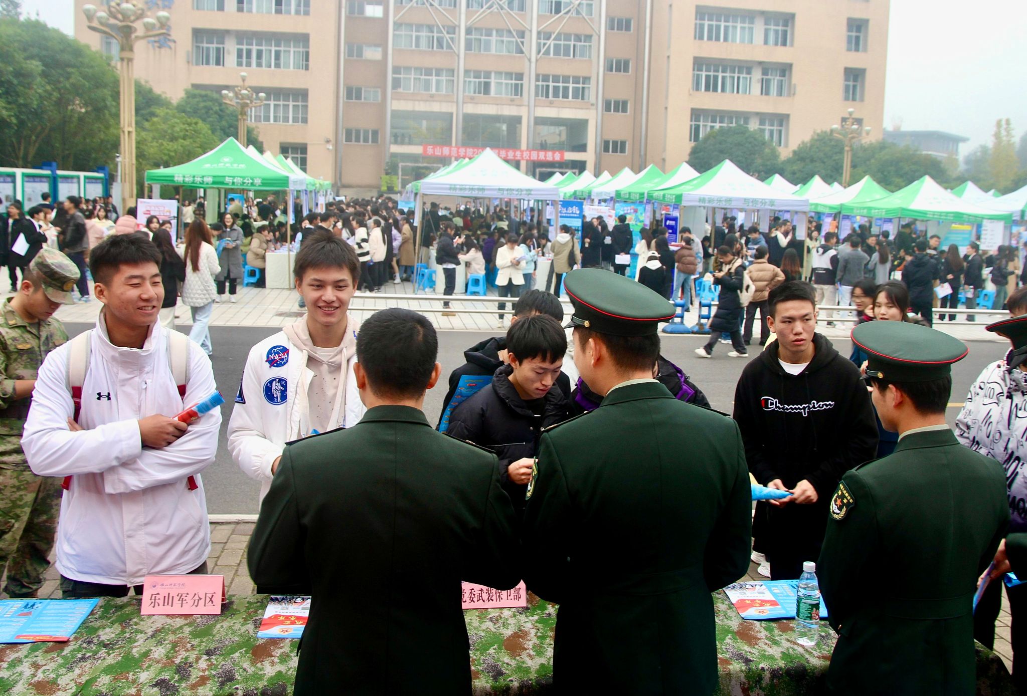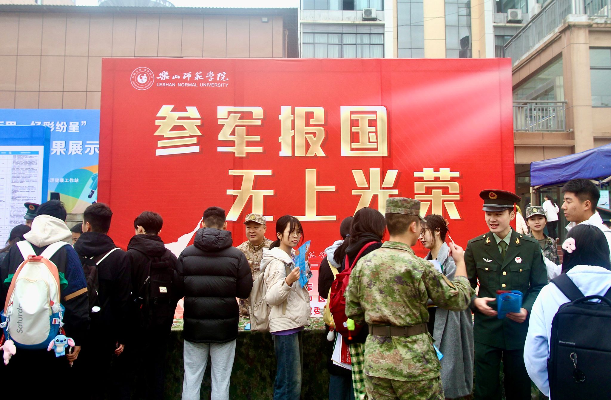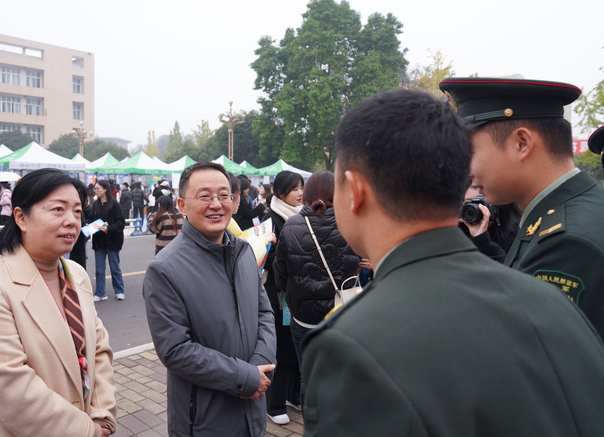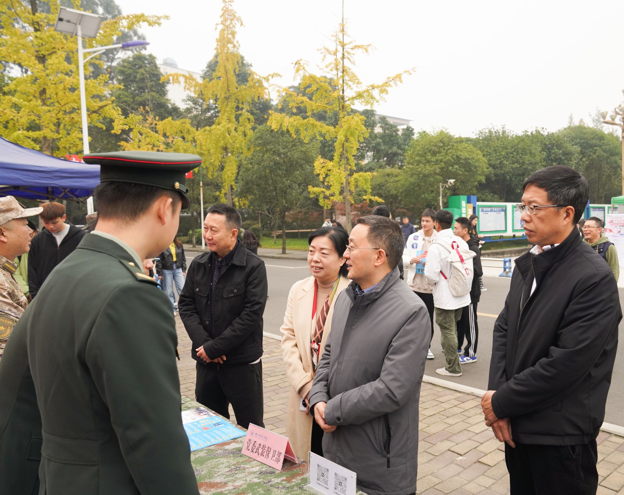 本网讯(文/杜颖 图/孟繁增、薛小丽)为全面贯彻落实习近平新时代中国特色社会主义思想和习近平强军思想,扎实推进学校2024年征兵工作,11月24日,学校党委武装保卫部抓住“校园双选会”契机,在北校区桂花广场开展2024年春季征兵宣传。党委副书记、校长刘进,党委副书记陈立志,党委常委、副校长陈范华、李朝晖到现场指导征兵宣传工作,党委武装保卫部负责人、征兵工作站全体同志及退役复学大学生代表参加了此次征兵宣传活动。