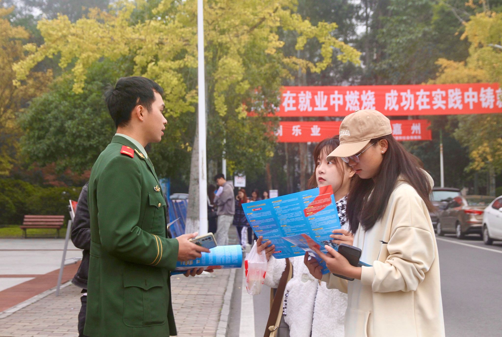 活动现场,征兵工作站老师及退役复学大学生志愿者向前来咨询的大学生全方位、深层次地向学生解读征兵相关政策及流程。就应征报名、体检、政治审查、兵种选择、预定兵安排、学费补偿、学籍保留、转专业、考研、复学等热点问题,逐一进行了详细解答。对大学生们关心的军事生涯规划、军队待遇及军人职业发展给出了指导性建议。通过以退役复学大学生现场分享参军经历的方式,有效激发了更多应届毕业生参军报国热情。一名即将毕业的同学激动地说:“通过今天的现场咨询,自己对参军报名流程更为清晰,对各项优惠政策有了详细的了解,希望自己能追随学长学姐的脚步光荣参军,报效祖国。”