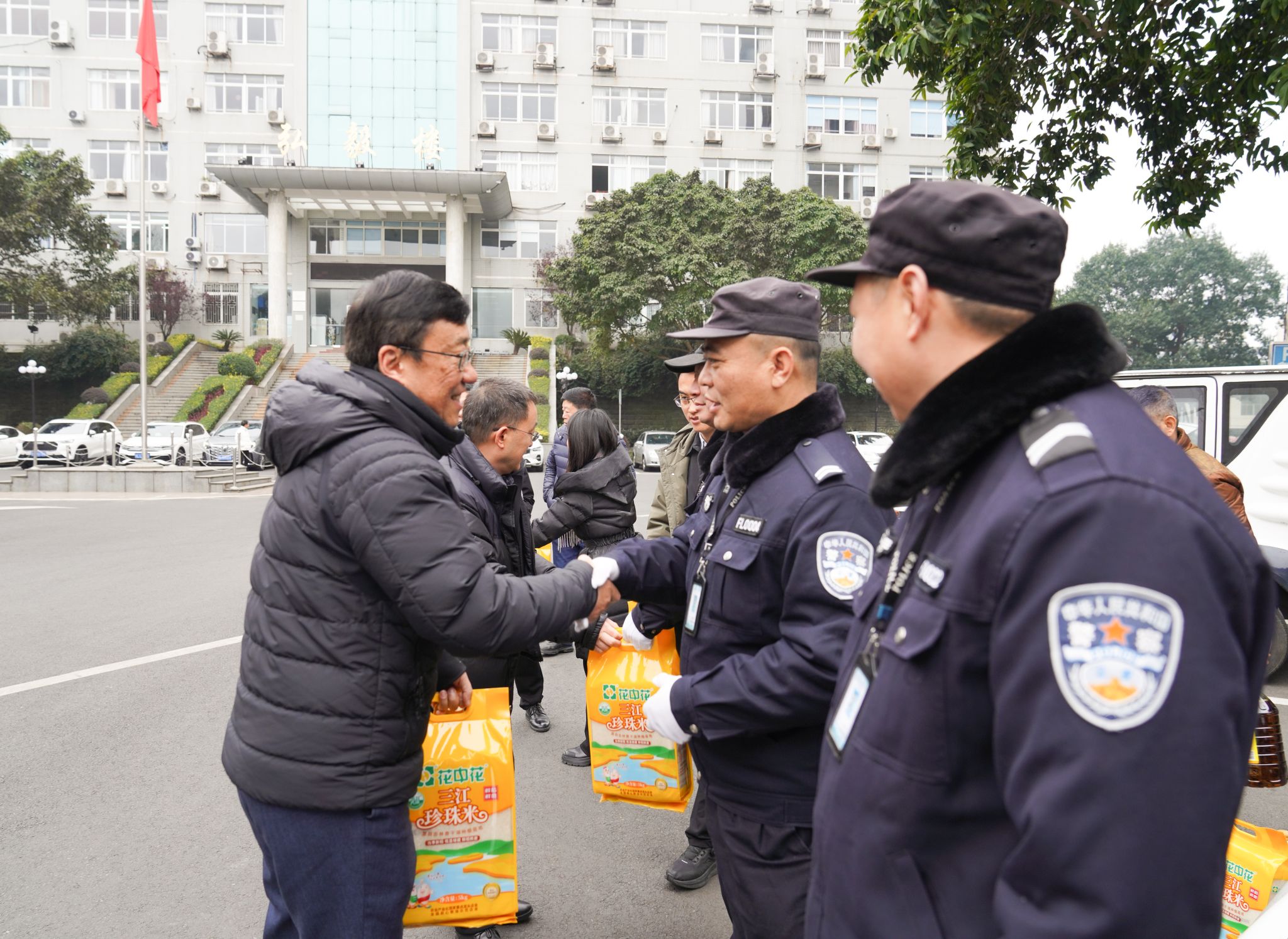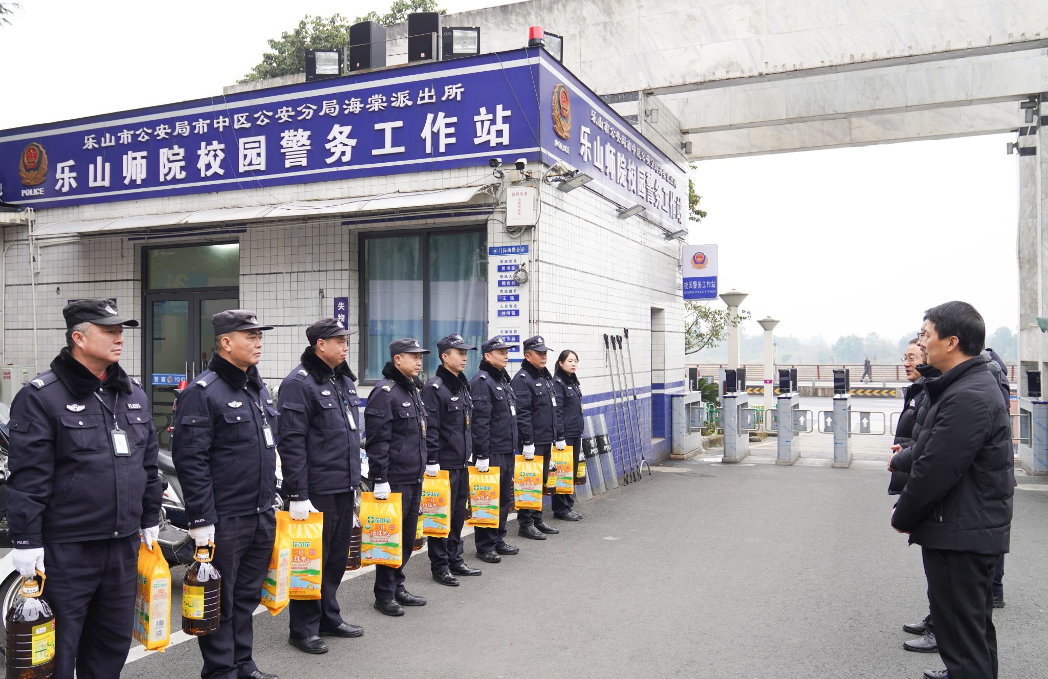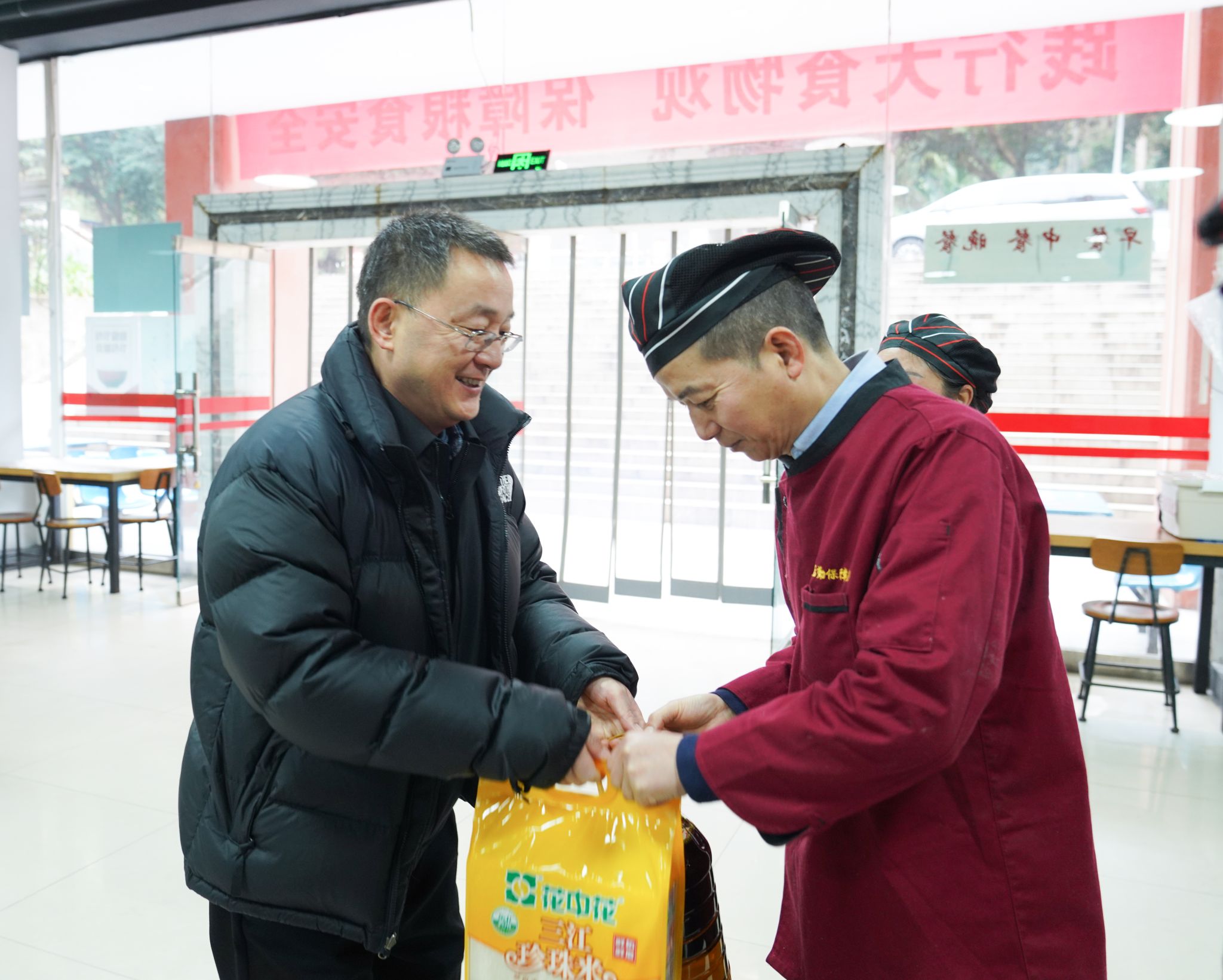 随后,校领导看望慰问了学校保卫人员和后勤服务人员,向他们致以节日问候,送上新春祝福。在学校校园警务站,胡丹、刘进一行亲切与保卫处安保人员握手交谈,并为大家送上大米、油等慰问品。刘进说,寒假和春节期间,为保障校园的安全稳定,同志们放弃了与家人团聚的机会,舍小家、保大家,无私奉献,辛勤工作,向大家表示衷心感谢。并特别叮嘱值班人员要加强寒假期间校园值班值守,落细落实安全保障各项措施,做好校园重点场所的日常巡查工作,确保校园安全稳定和师生幸福安宁。同时保卫处要把值班人员节日期间生活安排好,让大家过一个喜庆祥和、欢乐温暖的春节。