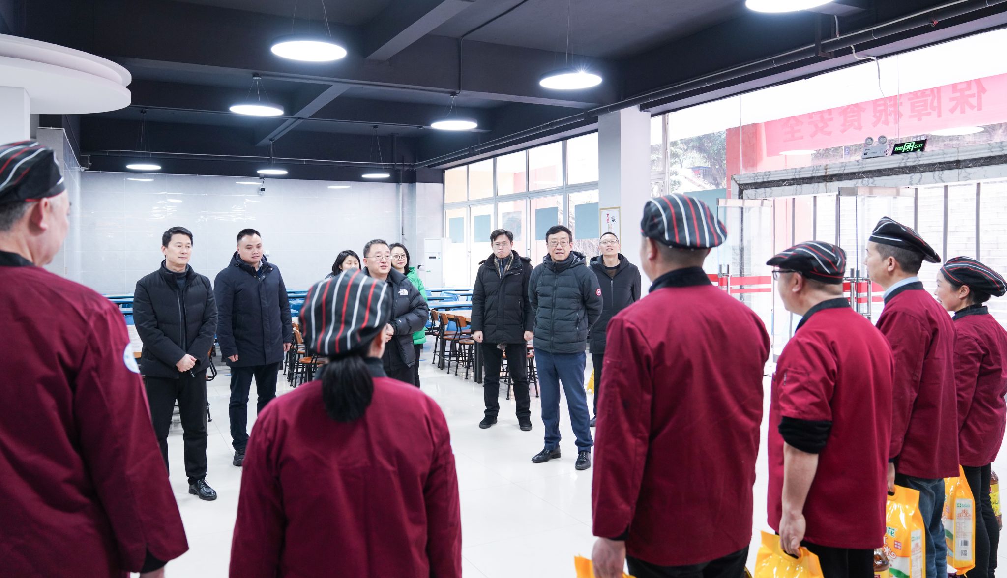 在百景苑食堂,校领导详细了解了寒假期间校园后勤保障安排情况。胡丹、刘进一行向坚守一线的后勤工作人员表示敬意和感谢,并叮嘱大家说,同志们一定要加强寒假期间校园服务保障,做好寒假期间留校值班的教师员工和学生的伙食安排。