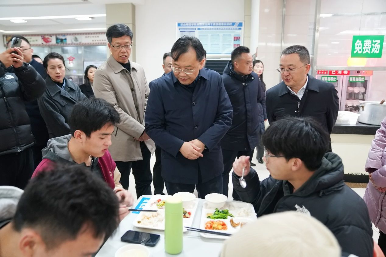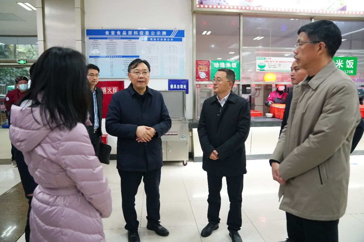 张澜涛来到武珈山嘉汇苑食堂,了解食堂开餐准备及消防安全等情况。在食堂1楼,有学生正在用餐,张澜涛向同学们了解食堂的饭菜价格、质量、味道、品种。1位男同学说:“我今天打了两个荤菜和1个素菜,加上饭一共7元钱。”听了他的介绍,张澜涛关切地询问:“男同学运动量大,够不够吃,味道好不好?”同坐一桌的几位同学回答道:“饭菜的量够吃,味道也挺好的。”在与食堂管理人员的交流中,张澜涛指出,要高度重视食堂的食品安全卫生,落实食品安全监管责任制,重要岗位要定期轮岗,铸牢食品安全防线。