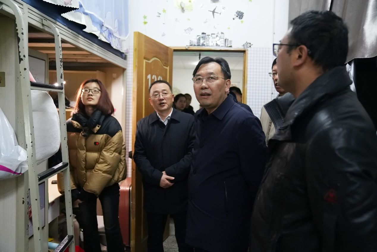在新3幢学生宿舍,张澜涛向同学详细询问了宿舍用电用水安全、空调使用费用等。当听到学校免费给学生宿舍安装空调,解决同学们的急难愁盼问题时,张澜涛说,高校后勤要以党的二十大精神为指引,坚持党的全面领导,清醒认识到在后勤地位作用认识的“高度”、后勤硬件设施投入的“力度”、后勤队伍能力提升的“速度”、后勤风险隐患排查的“精度”、后勤舆情研判处置的“深度”、学生后勤保障服务的“温度”等“六个维度”上存在的差距,在强化政治引领、强化以人为本、强化规范管理、强化生态保护、强化队伍建设、强化统筹部署等“六个强化”上持续用力,推动学校后勤保障服务工作再上新台阶。