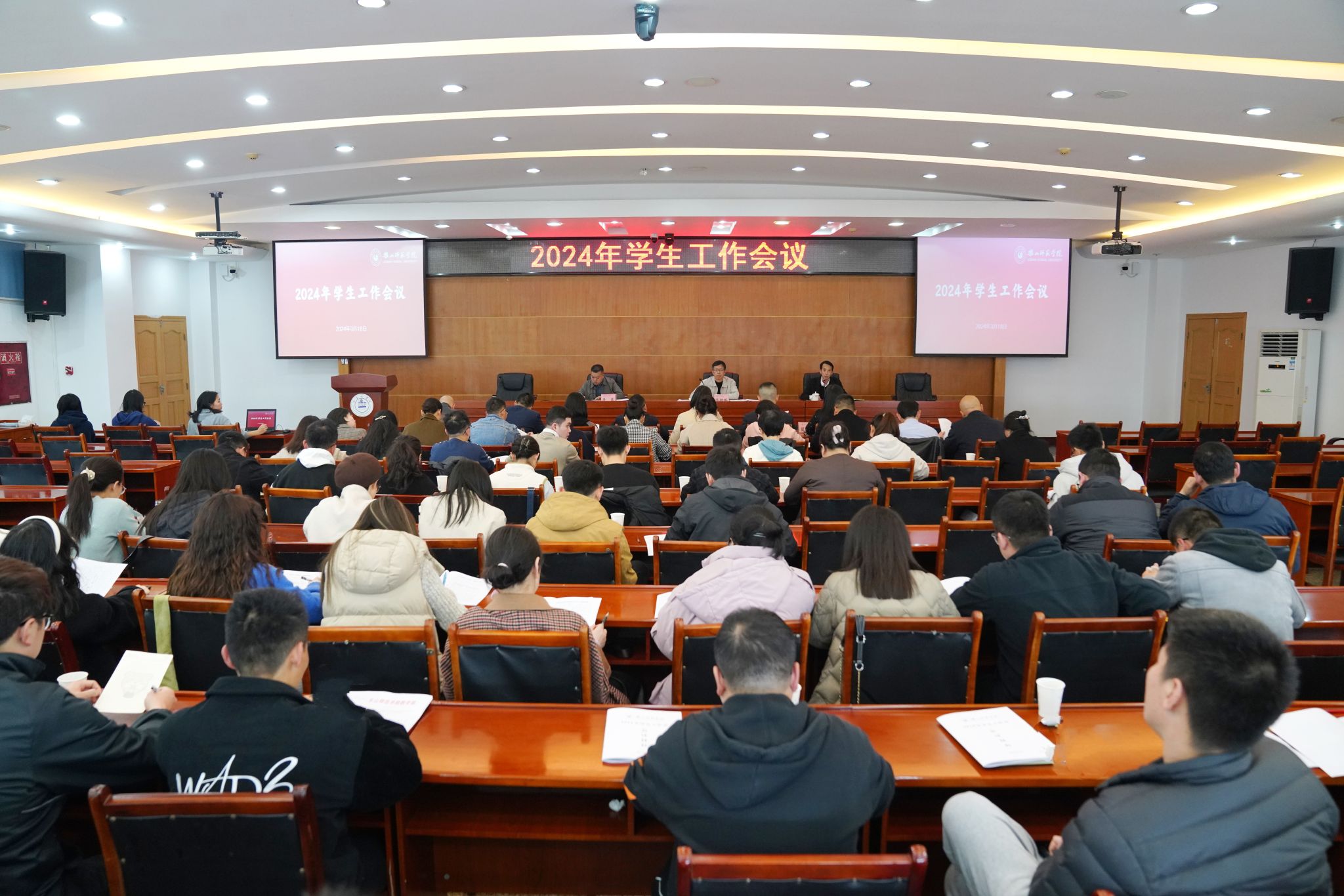 本网讯(文/谭妙 图/梁晨)为保障新学期学生工作有序推进,3月18日下午,我校于图书馆学术报告厅召开2024年学生工作会议。党委常委、副校长李朝晖出席会议并讲话,党委学生工作部、校团委全体成员,各教学院党委副书记、辅导员参加本次会议,会议由党委学生工作部部长黄显刚主持。