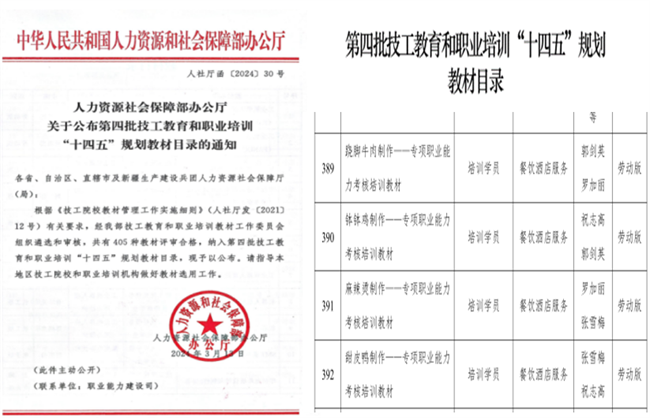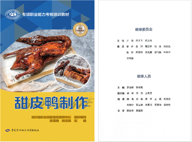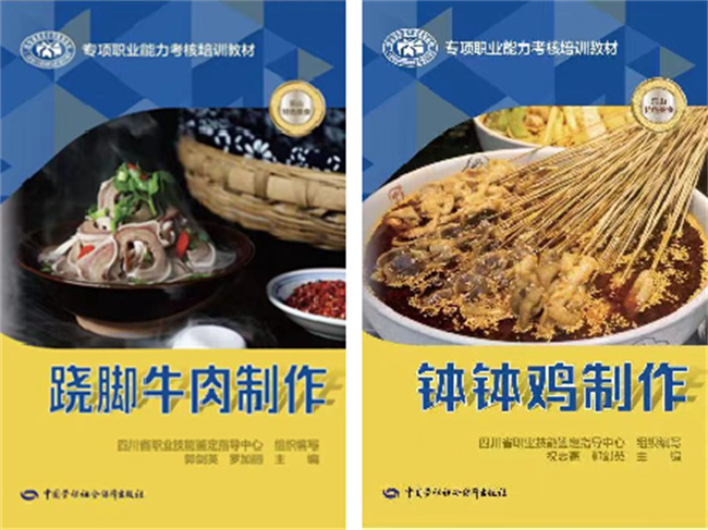 本网讯(文图/薛文娟)近日,人力资源和社会保障部(以下简称“人社部”)办公厅发文公布第四批技工教育和职业培训“十四五”规划教材目录。由四川省职业技能鉴定指导中心指导、乐山市嘉州美食文化研究院组织编写,中国劳动保障出版社出版的乐山四大特色美食《钵钵鸡制作》《跷脚牛肉制作》《麻辣烫制作》《甜皮鸭制作》专项职业能力考核培训教材成功入选!我校汪天飞副校长、乐山市嘉州美食研究院院长祝志高为本套教材编委主任,祝志高及旅游与地理科学学院郭剑英教授等主编的《翘脚牛肉制作》《钵钵鸡制作》《甜皮鸭制作》3本专项职业能力考核培训教材荣列其中。