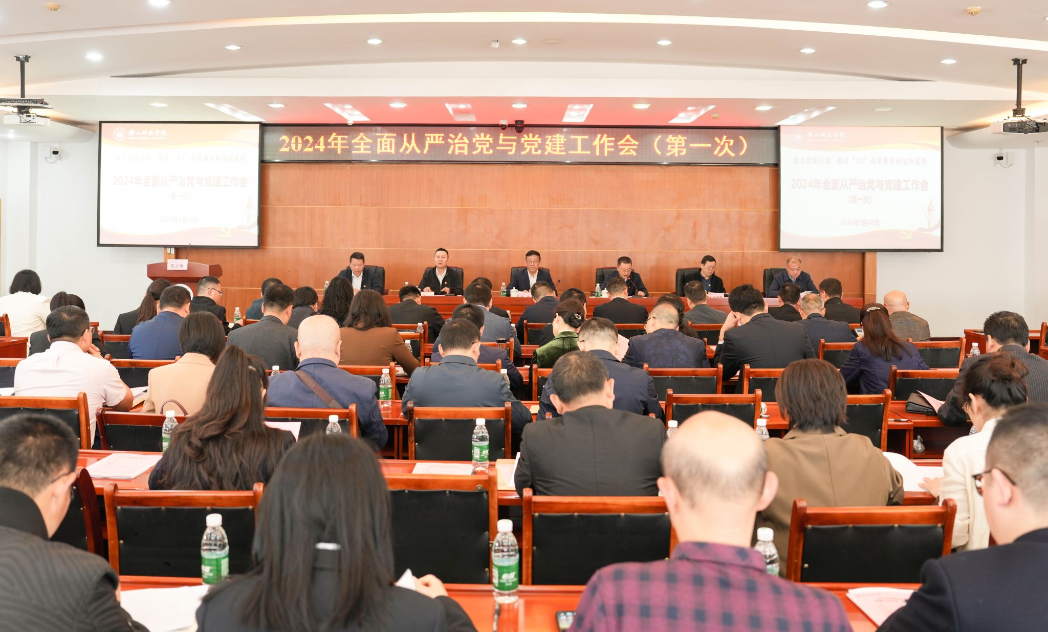 本网讯(文图/杨爽)3月28日,我校在图书馆学术报告厅召开2024年全面从严治党与党建工作会议(第一次)。校党委书记胡丹,校党委副书记、校长刘进,校党委副书记、校工会主席陈立志,校党委副书记、纪委书记彭尚源,校党委常委、党委组织部部长佘万斌,校党委常委、党委宣传部、党委统战部部长杨锐出席会议,各相关二级党组织、职能部门负责人参加会议。会议由刘进主持。