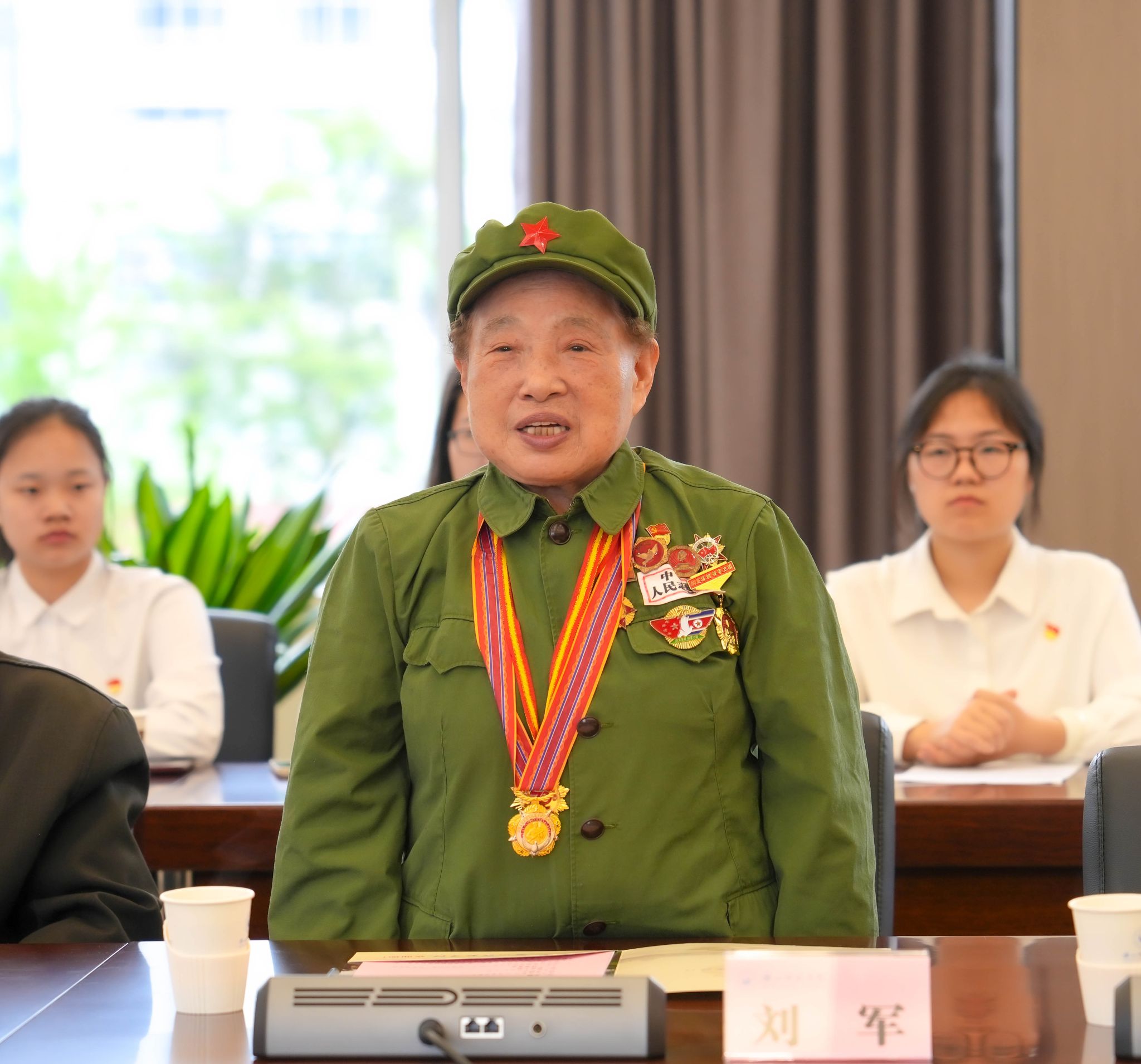 座谈会上,大家一同观看视频了解老兵们的战斗经历,重温那段惊心动魄的岁月。已经82岁高龄的刘军奶奶向大家讲述了战争中的亲身经历,她十岁进入志愿军文工团,是全国年纪最小的志愿军战士。刘奶奶恳切的言辞、真挚的爱国情怀,赢得了在场师生的阵阵掌声。学者代表魏奕雄分享了自己多年来编撰《滇缅战场追忆》《抗美援朝战场追忆》等文史的心路历程。志愿者代表廖翔与大家分享了自己在走访抗美援朝老兵过程中的所见所闻,现场向大家展示了老兵们的纪念章、军功章、医用口罩等珍贵的实物资料,并为大家讲述每一件纪念品背后的故事。