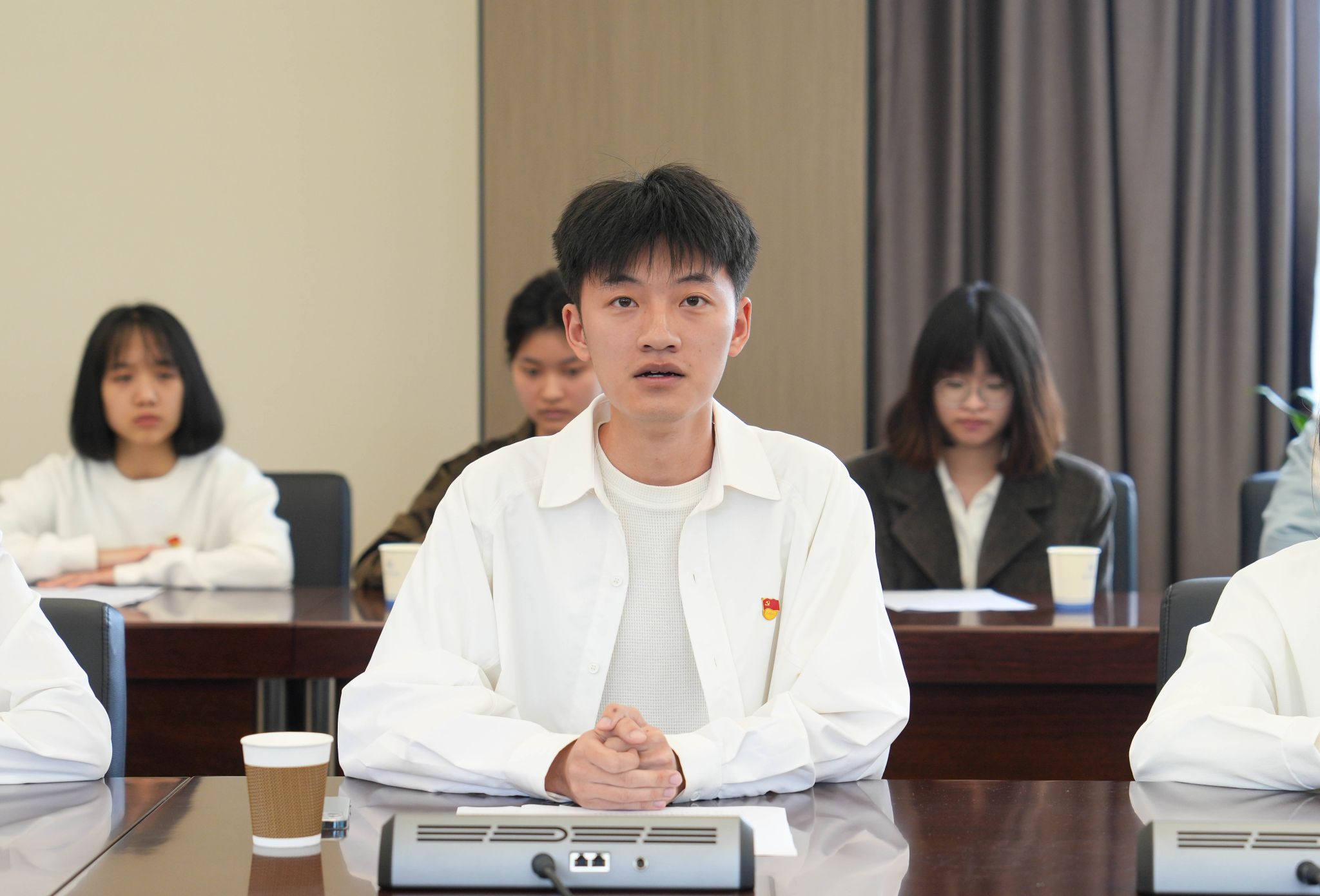 嘉宾与学生党员交流互动环节中,学生党员代表房靖翔与大家分享了自己的所思所想,他表示三位嘉宾的分享让他深感震撼,作为党员将以老兵们为榜样,不断提高思想觉悟,用实际行动践行党员职责。