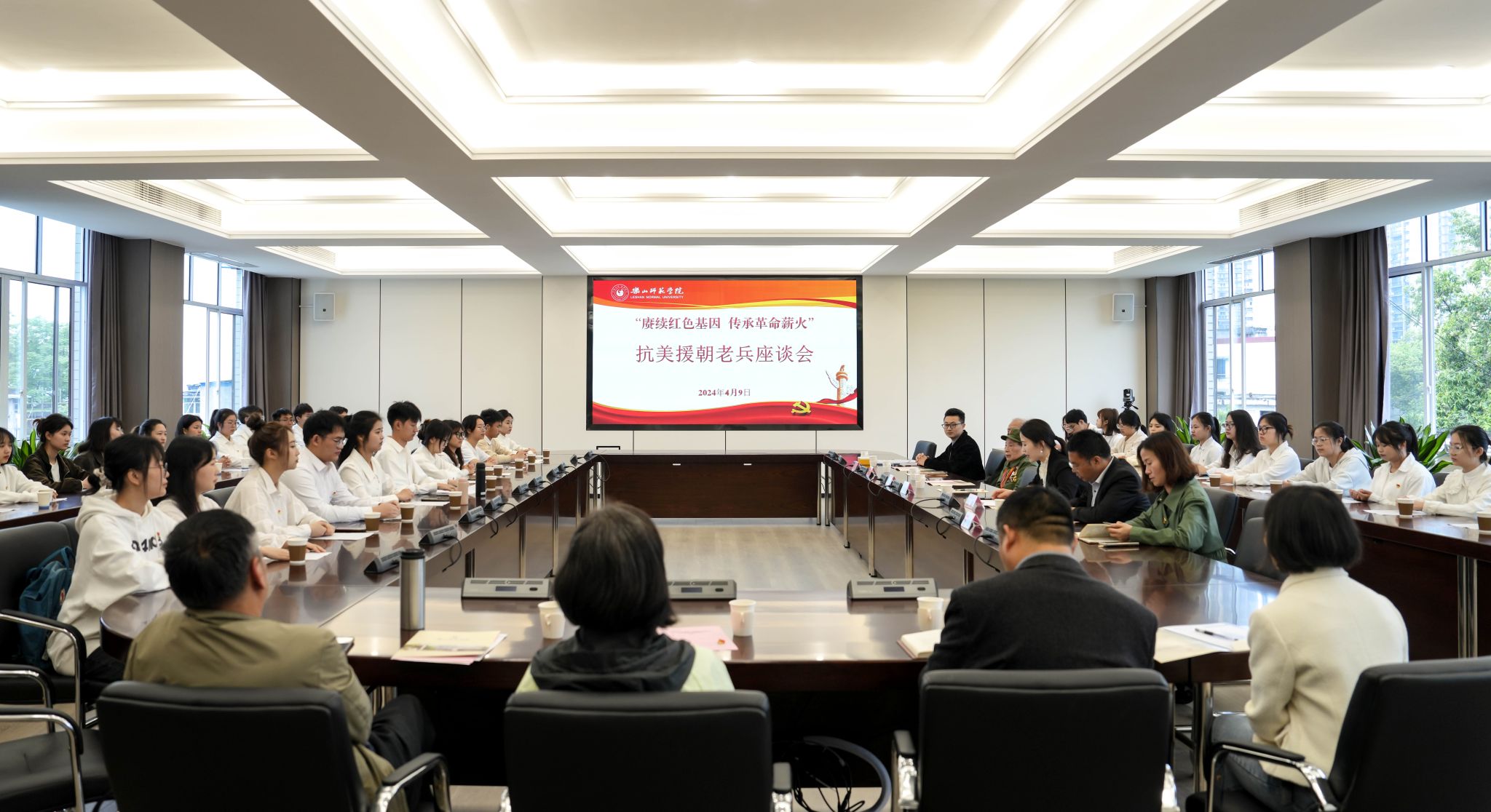 本网讯(文/鲁园 图/杨爽)4月9日,由党委组织部主办,党委学生工作部承办的抗美援朝老兵座谈会在弘毅楼704召开,会议特别邀请到了志愿军战士代表刘军、学者代表魏奕雄、志愿者代表廖翔。党委组织部副部长周琴、副部长左莉、党委学生工作部副部长胡平建、党委组织部全体教师、党委学生工作部思政科教师及15个教学院45名学生党员代表参加了会议,会议由党委组织部副部长左莉主持。