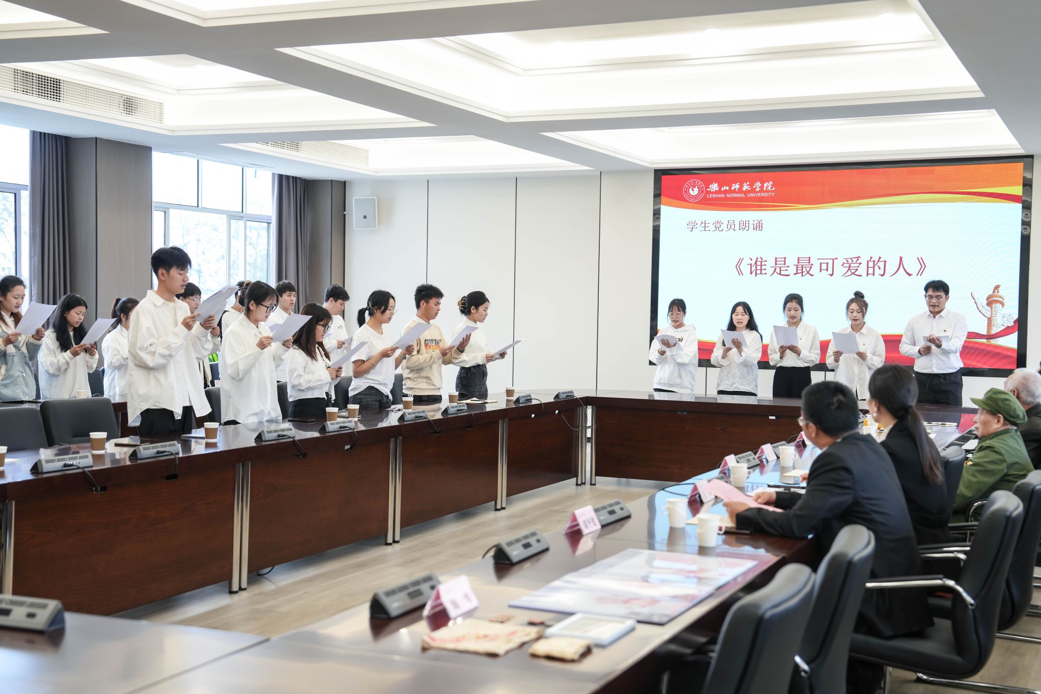 座谈会上,全体学生党员深情朗诵《谁是最可爱的人》,向抗美援朝老兵致以崇高的敬意。