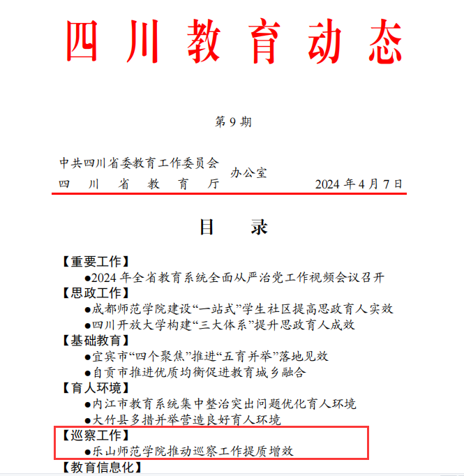 本网讯(文图/许亚梅)四川省委教育工作委员会、四川省教育厅主办的《四川教育动态》2024年第9期,以《乐山师范学院推动巡察工作提质增效》为题,专题报道了我校推动巡察工作提质增效的相关举措。