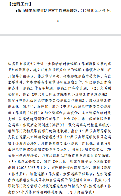 学校修订《中共乐山师范学院委员会巡察工作实施办法》,制定《中共乐山师范学院委员会巡察工作规程》,推动巡察工作规范化、制度化、程序化。出台《中共乐山师范学院委员会巡察组工作规则(试行)》细化巡察组实施责任,成立巡察组临时党支部,发挥党建引领示范作用。出台《中共乐山师范学院委员会巡察工作联席会议制度(试行)》,强化巡察与纪检监察机关、组织部门及相关职能部门的沟通联动。出台《中共乐山师范学院委员会巡察人才库建设管理办法》《中共乐山师范学院委员会巡察干部培训办法》,打造高素质专业化巡察干部队伍。设置《乐山师范学院党委巡察监督参考要点》,明确19项监督要点,70余条问题表现形式,为推动巡察工作高质量发展奠定坚实基础。