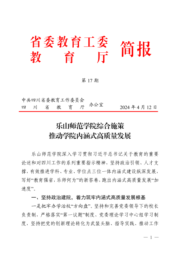 编者按:学校深入学习贯彻习近平总书记关于教育的重要论述和对四川工作的系列重要指示精神,积极探索学校“113”高质量发展思路,坚持政治引领、人才支撑,有效推进“学科、专业、学位点”三位一体内涵式建设纵深发展,写好“教育强省,乐师何为”的新答卷,跑出内涵式高质量发展“加速度”。4月12日,省委教育工委、教育厅简报第17期专题介绍了我校综合施策推动学院内涵式高质量发展的经验做法。