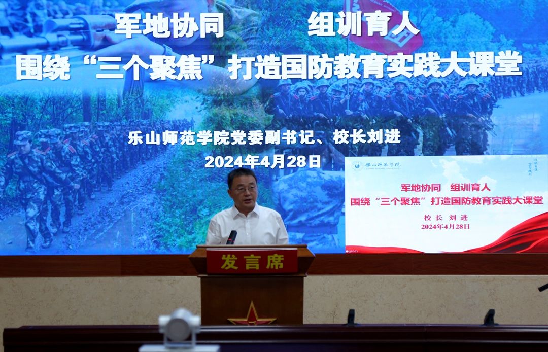 本网讯(文/刘艳萍 图/省军区天府长城、乐山军分区)4月28日,四川省2024年度学生军训联席会在成都召开。四川省军区副司令贾全林,教育厅副厅长蔡光洁在主会场出席并讲话。学校党委副书记、校长刘进在乐山军分区分会场参加会议,并作为全省唯一高校代表,以《军地协同组训育人 围绕“三个聚焦”打造国防教育实践大课堂》为题作经验交流发言。