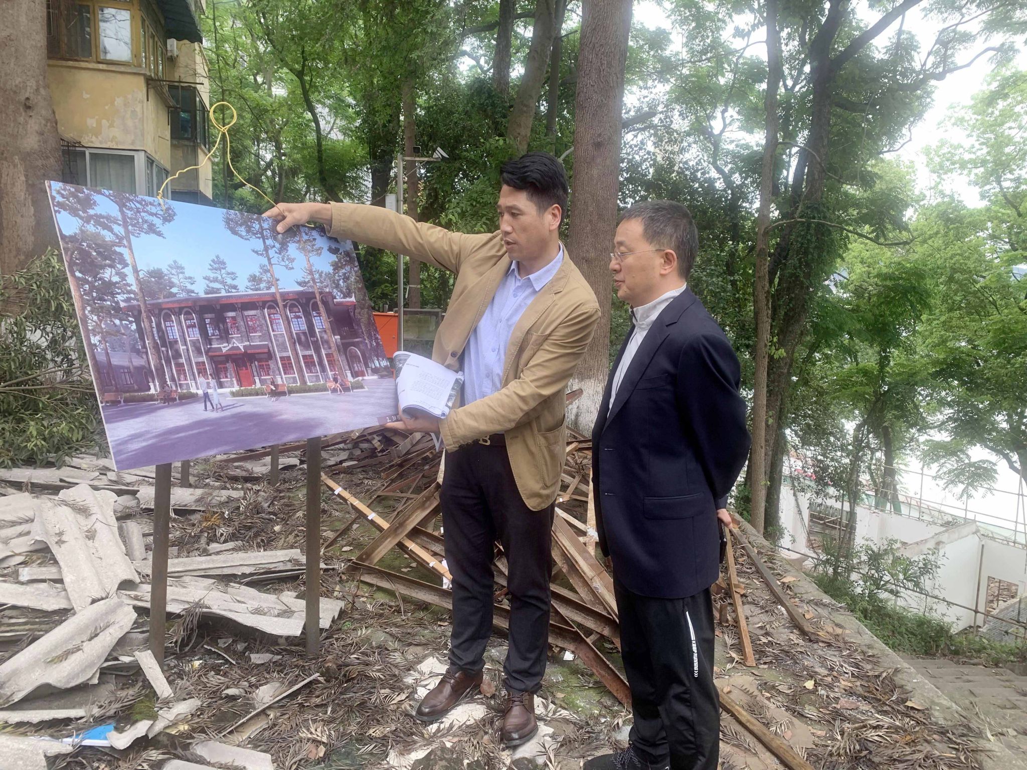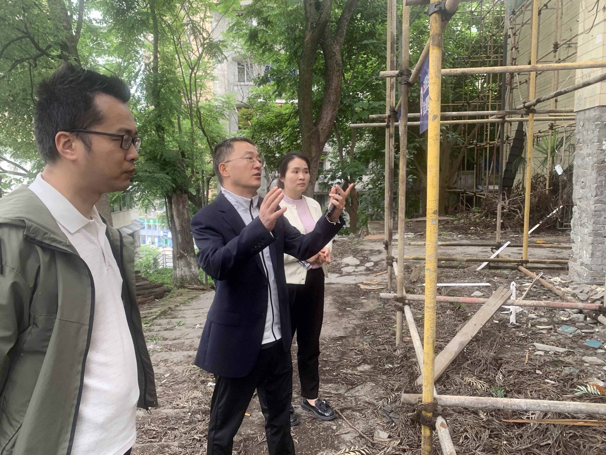 在项目施工现场,基建处处长宋天华汇报了北斗山灰楼项目进场施工以来的施工情况。设计单位对灰楼外立面设计及周边风貌改造方案作了简要介绍,施工单位就外立面材质比选方案作了介绍。刘进现场指导了灰楼外墙材料的比选,要求施工单位在保障选材质量的前提下,做好色彩比例搭配,充分呈现出修旧如旧的厚重感和历史年代感。
