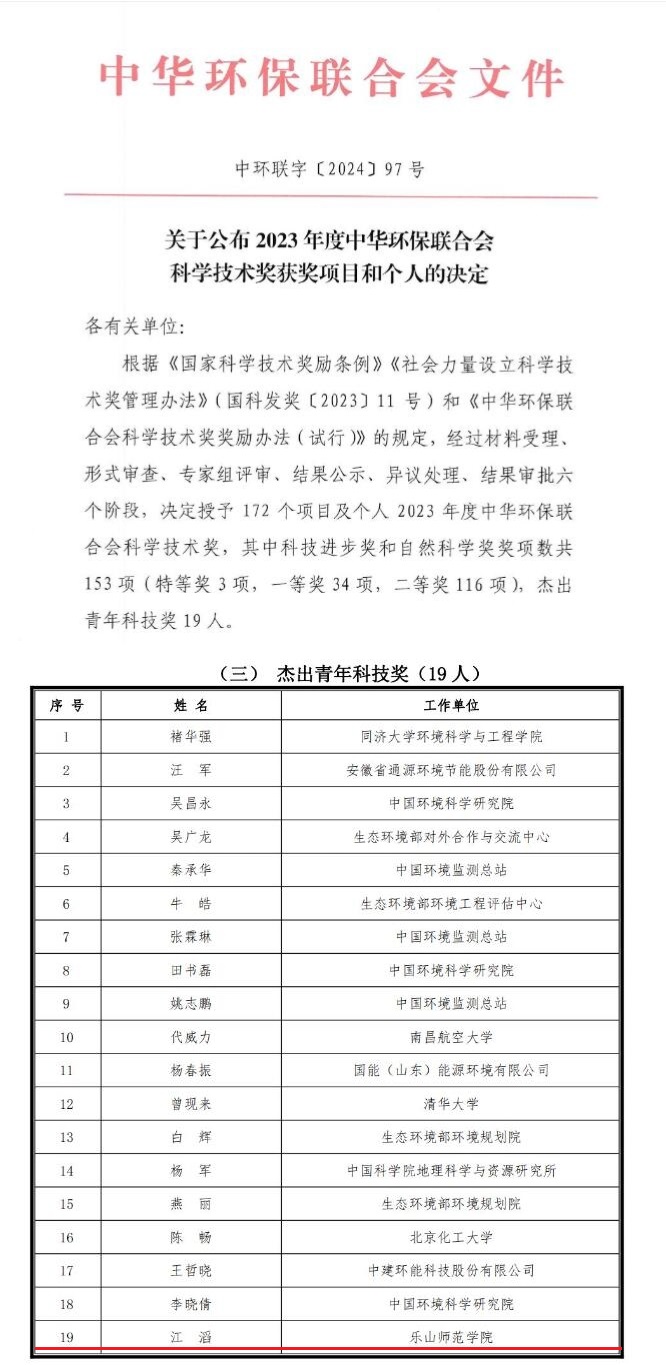 本网讯(文图/王雪猛)近日,中华环保联合会印发了《关于公布2023年度中华环保联合会科学技术奖获奖项目和个人的决定》(http://www.acef.com.cn/a/fzzx/news/2024/0506/28861.html),我校江滔教授获“中华环保联合会杰出青年科技奖”,为我校首次获得该奖项的个人,也是本次川内高校及科研院所唯一获得该奖项的个人。