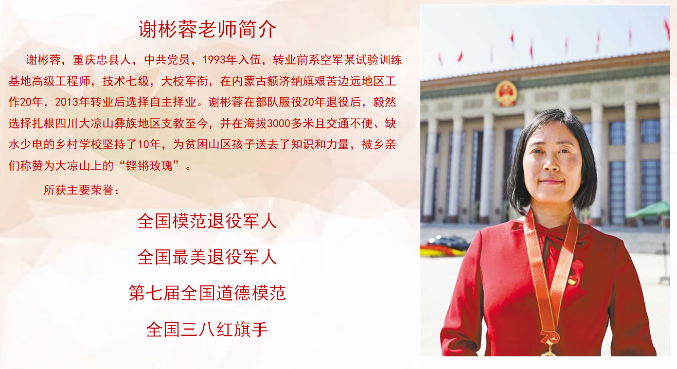 谢彬蓉老师大学毕业从军,在艰苦边远地区服役20年,2013年退伍转业后,毅然选择扎根四川大凉山彝族地区支教,在海拔3000多米且交通不便、缺水少电的乡村学校工作奉献了10年,为山区孩子送去了知识和力量,被乡亲们称赞为大凉山上的“铿锵玫瑰”。报告会上,谢彬蓉老师以《山长水远耕沃土,甘做春泥护红花——我的支教生涯感悟》为主题,结合自身从军生涯、支教生活中的学习和工作的经历,用朴素的语言、真挚的感情,讲述了自己的奋斗历程,充分展现了谢彬蓉老师面对困难迎难而上、用知识和汗水改变贫困山区孩子的生活习惯和文化水平的高贵品质,诠释了无私奉献的大爱精神,体现了谢老师不忘初心、牢记使命的忠诚与担当,践行了“老兵永远跟党走”的铿锵誓言。