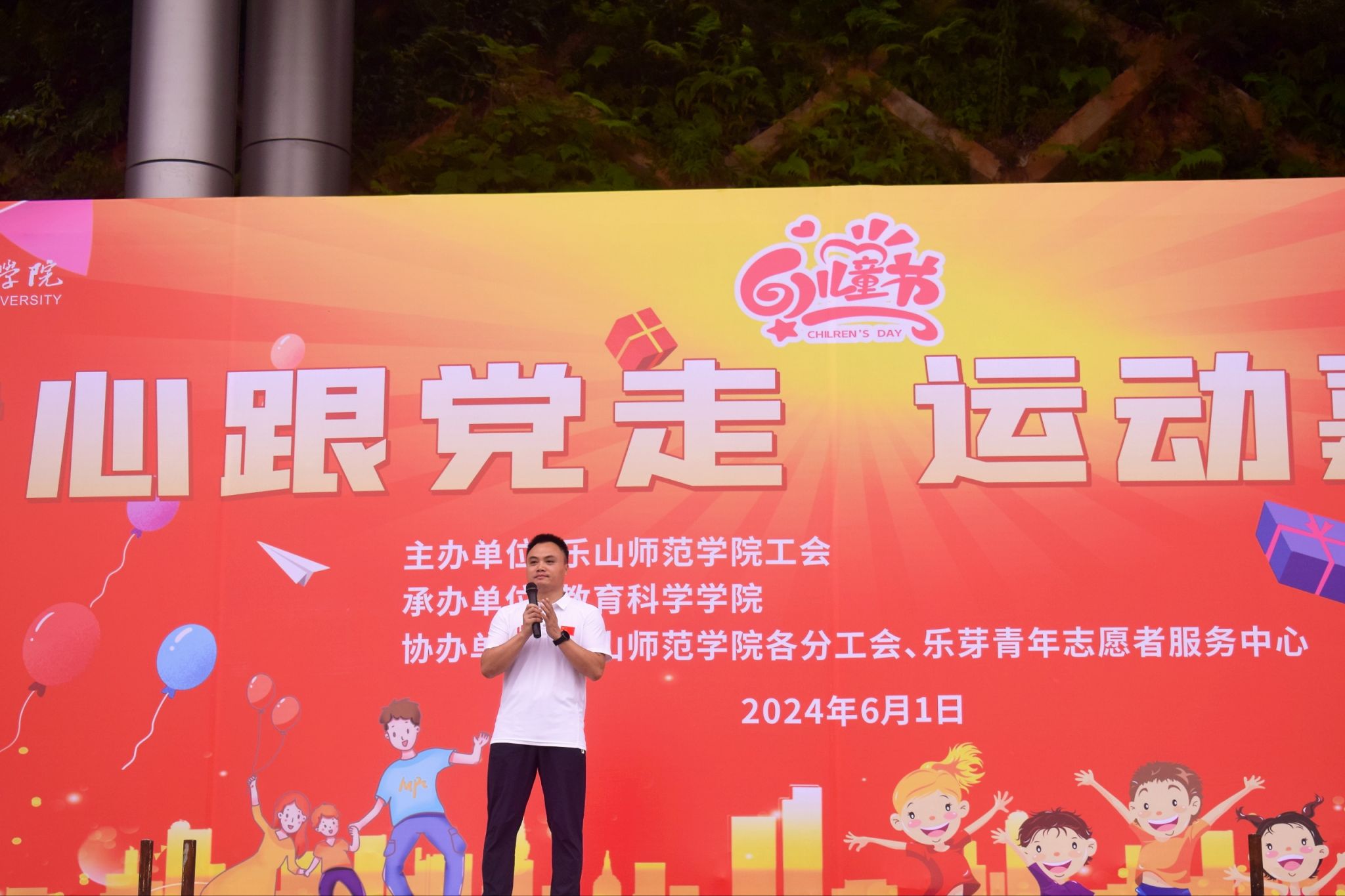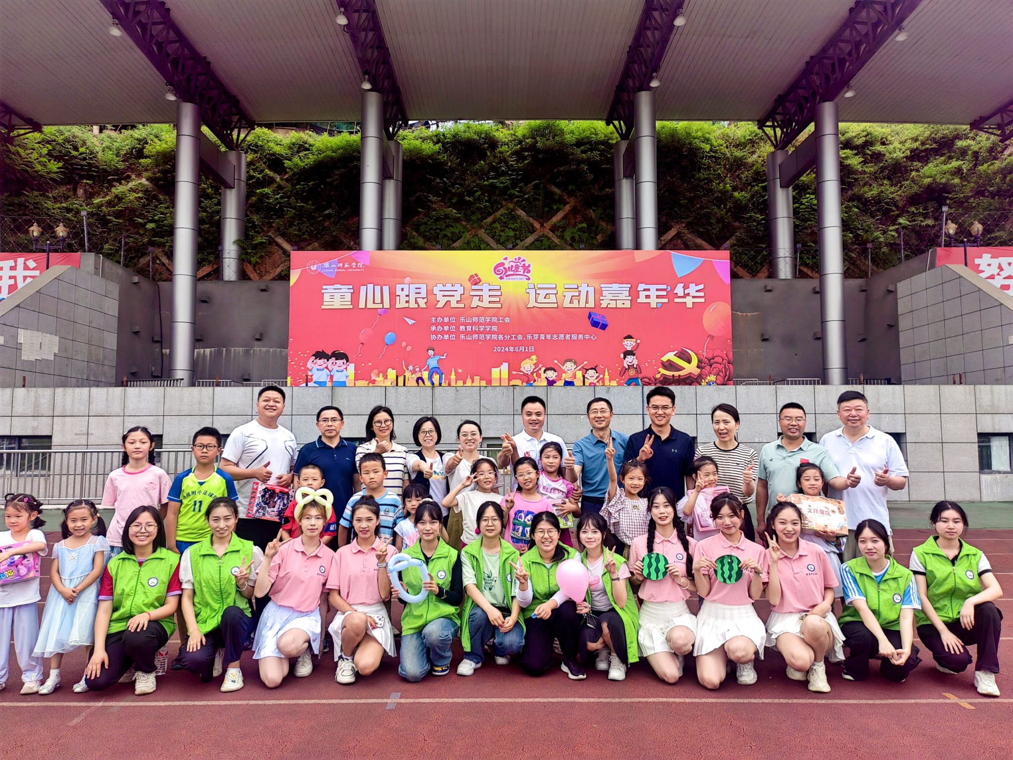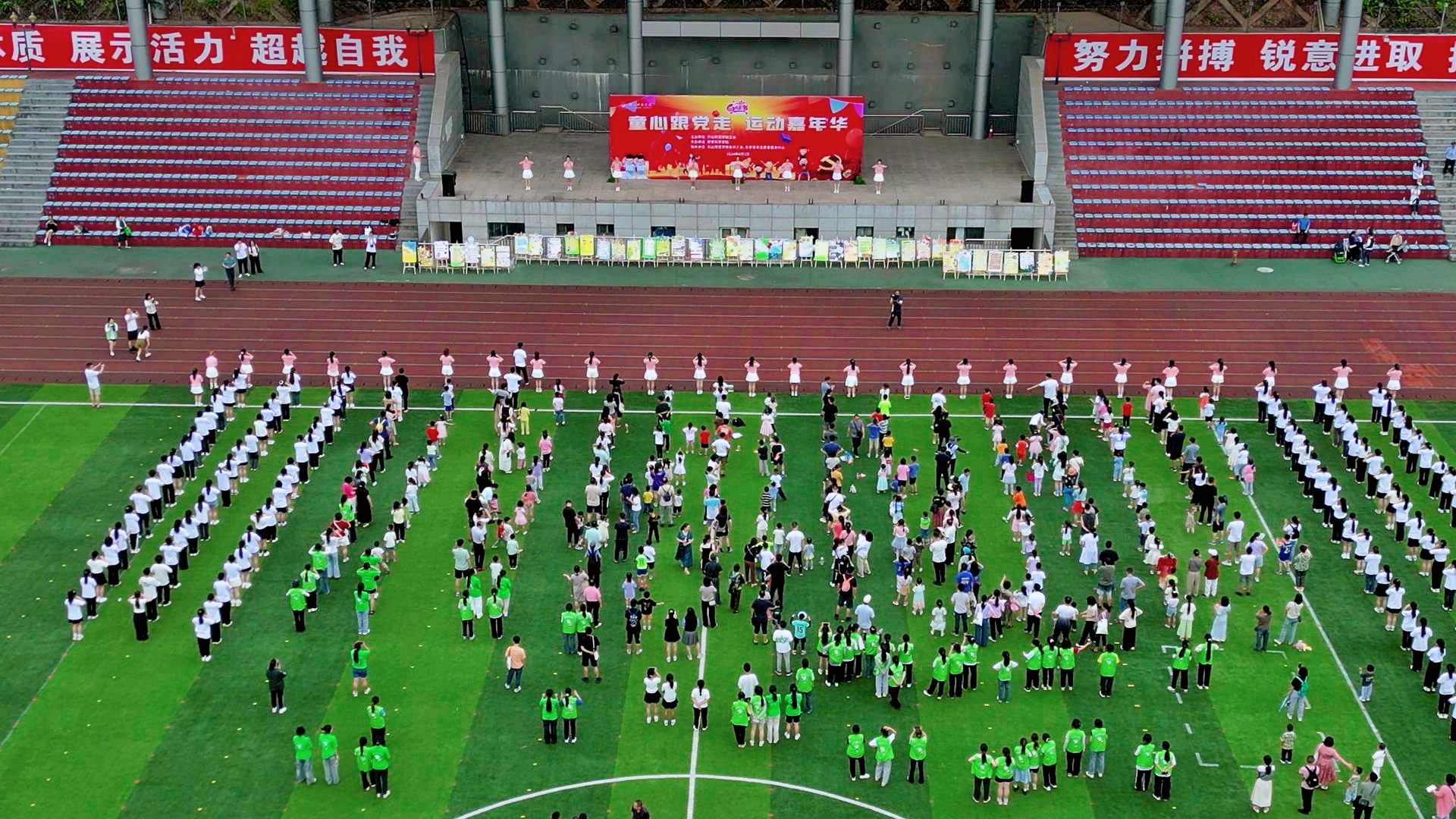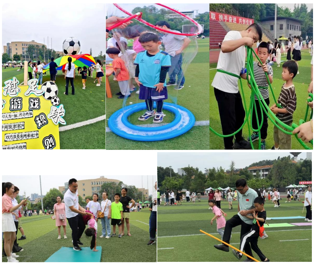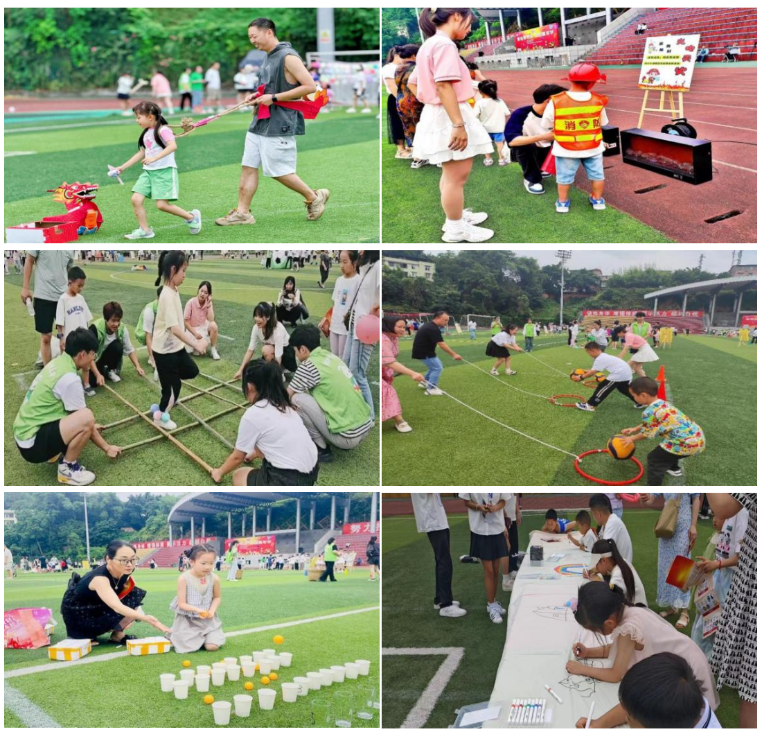 本网讯(文/陈秋香 图/“乐芽”志愿者团队)为深入贯彻习近平总书记提出的“广泛开展全民健身活动,加强青少年体育工作,促进群众体育和竞技体育全面发展,加快建设体育强国”理念,6月1日,在这个属于童年的特别日子里,由校工会主办、教育科学学院承办,各分工会和乐芽志愿者服务中心协办的“童心跟党走,运动嘉年华”的六一亲子运动游戏嘉年华活动在北校区体育场隆重举行。本次活动旨在通过丰富多彩的体育游戏和互动项目,增进家长与孩子之间的情感交流,同时培养孩子们的团队协作能力和对体育运动的热爱。