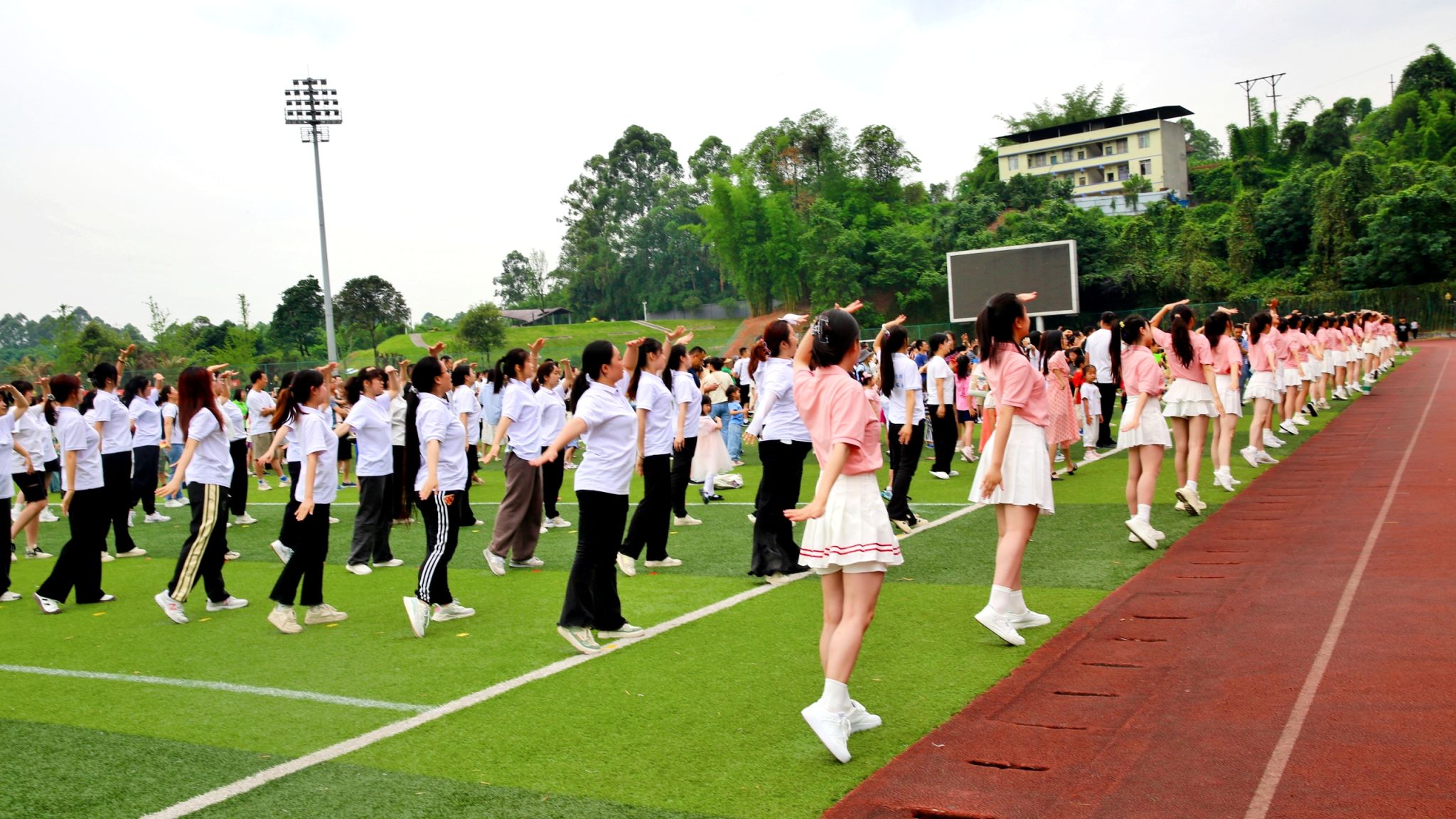 上午9点整,参与本次活动的近200组教职工家庭已经有序地来到活动现场进行集合签到和领取游戏手册,并由学校“乐芽”志愿者团队的哥哥姐姐们带到主席台前的点位站好。