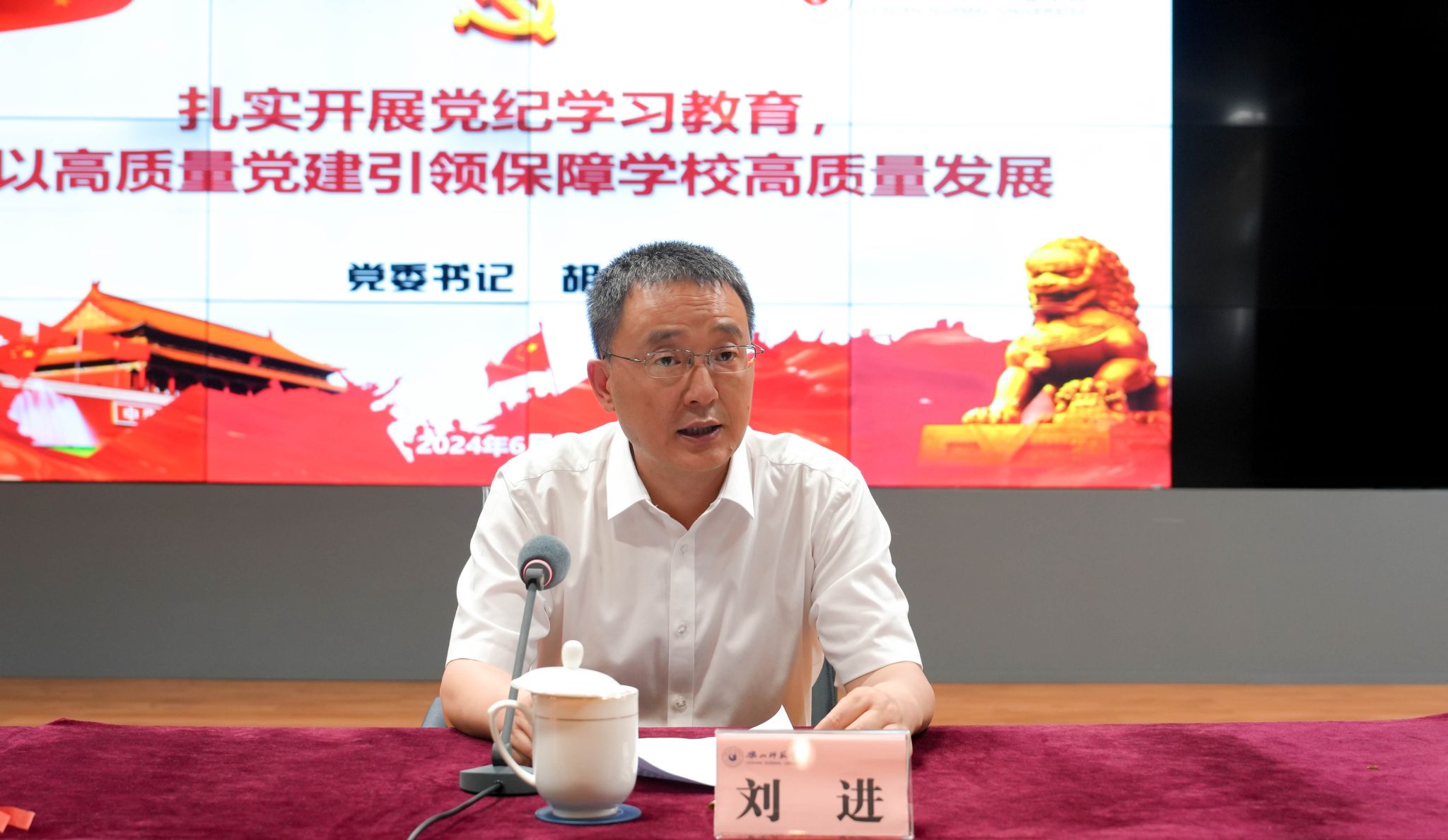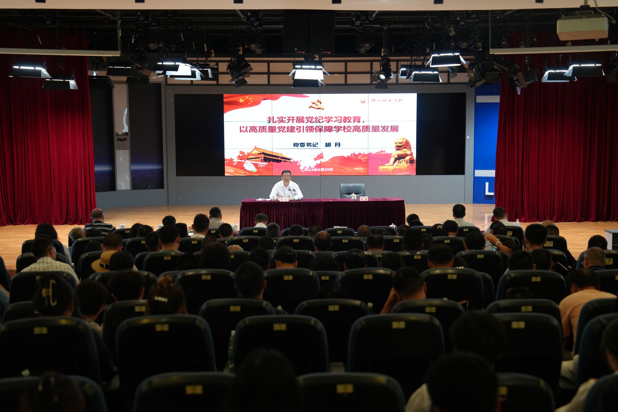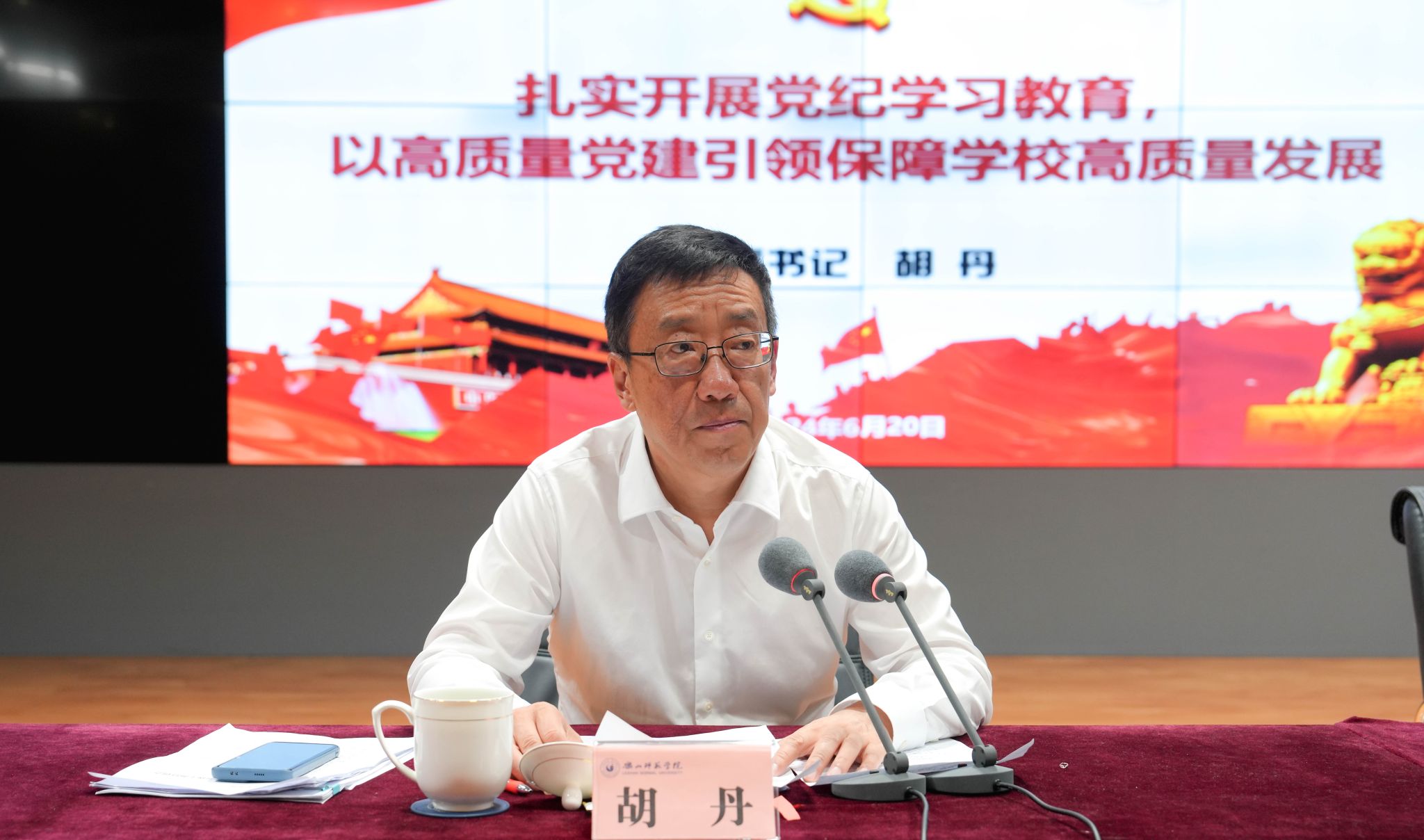 胡丹分析了党的纪律学习教育的历史演进,解读了新时代党的纪律学习教育的主要特点及重点内容,做出了以党纪教育引领保障学校高质量发展的重要部署,讲明了党纪学习教育的实践意义,为推动党纪学习教育走深走实指明了方向。他强调,党的纪律教育是整个纪律建设系统的基础性工程,只有加强纪律教育,统一思想认识,才能以知促行,认同党的主张,自觉遵规守纪。结合学校发展实际,他提出以下三点要求:一是提高政治站位,深刻领会党纪学习教育的重要意义。要进一步深化对加强党的纪律建设重要性和违反党纪问题危害性的认识,切实统一思想和行动,确保学校事业发展始终沿着正确的方向前进。二是坚持学懂弄通,深度掌握党纪学习教育的科学方法。要发挥示范带头作用学、坚持逐章逐条学、善于抓住重点学、联系实际学、坚持融会贯通学。三是坚持知行合一,深入推进党纪学习教育走深走实。要旗帜鲜明地把遵守政治纪律摆在首位,要严格遵守组织纪律、廉洁纪律、群众纪律、工作纪律和生活纪律。