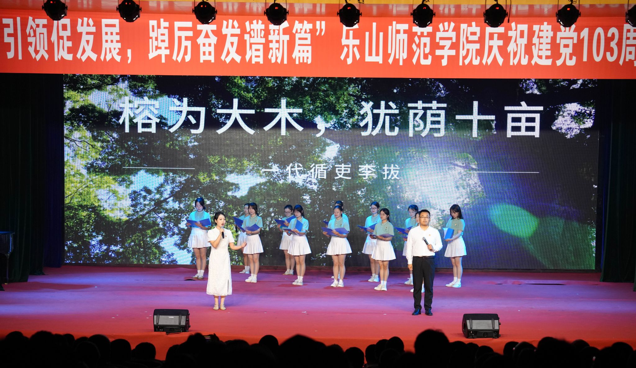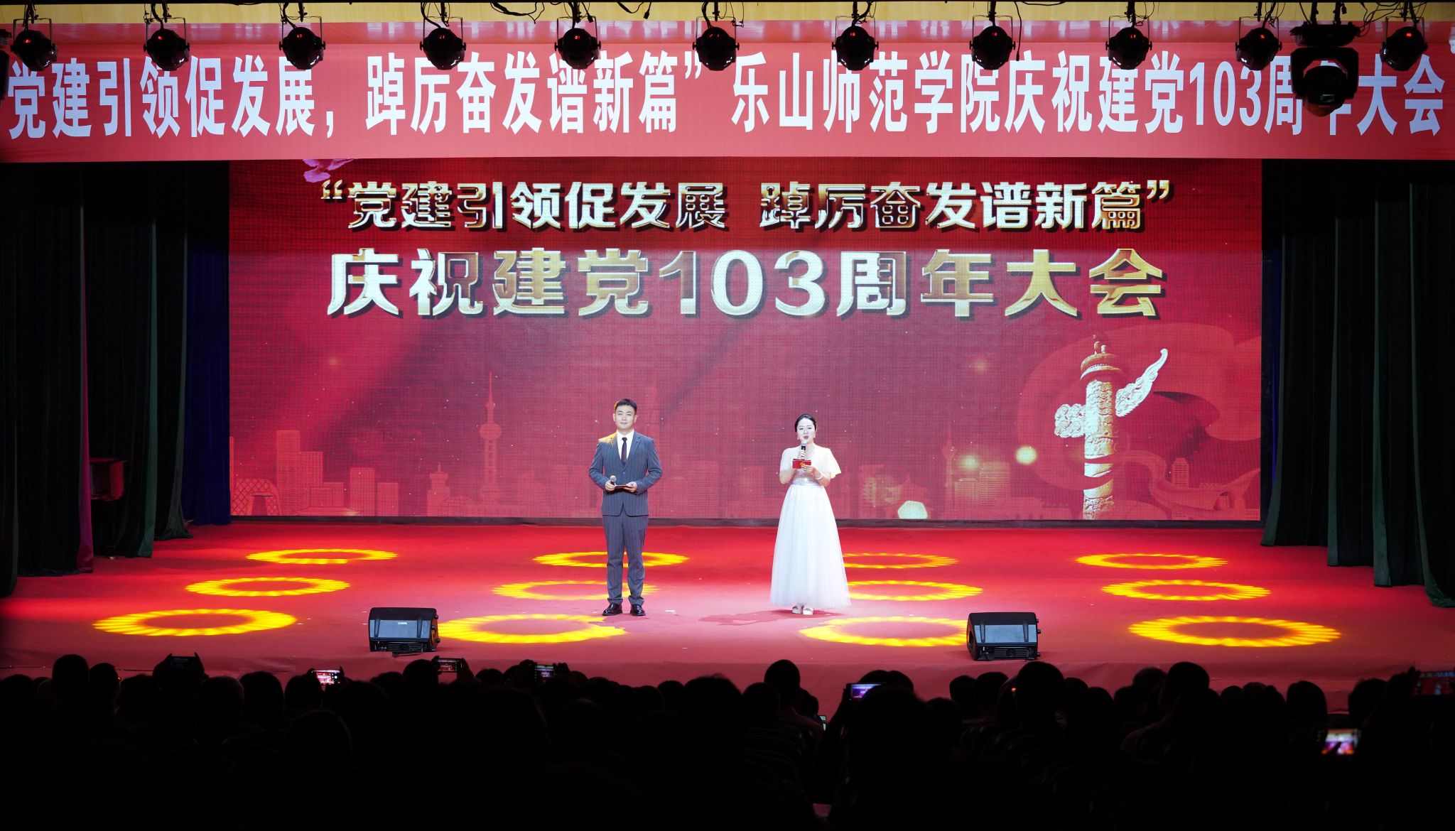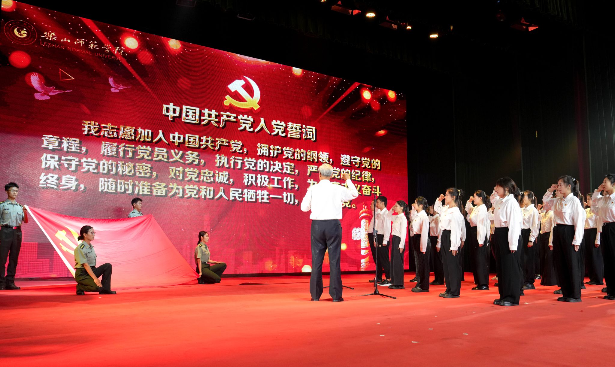 庆祝大会上,获得“光荣在党50年”纪念章的老党员周野带领新党员入党宣誓,全体参会党员重温了入党誓词。全体党员观看了2024年四川省党建工作重点任务成果展示——《青年党员说》展播。音乐学院师生讲述了红色音乐故事《英雄赞歌》,带领我们共同追忆抗美援朝期间的英雄事迹,将艺术元素与思政元素有机融合,为参会师生呈现了一场视觉盛宴和思政盛宴;马克思主义学院微党课《李拔》,展示了我校深入开展党纪学习教育,在抓严警示教育,强化以案促学见实效方面的成果;获得全国第七届大学生艺术展演舞蹈组一等奖、优秀创作奖,由30余名阳光又自信的特殊教育学院学生演绎的舞蹈《海棠花开一路红》,展现了我校在特殊教育人才培养,美育教育工作中的丰硕成果;文学与新闻学院学生配乐朗诵《丰碑》,指引着我们不忘初心,砥砺前行。最后,音乐学院师生带领全体参会党员高声齐唱《没有共产党就没有新中国》《唱支山歌给党听》《追寻》,将整场庆祝大会推向了高潮,并圆满闭幕。
