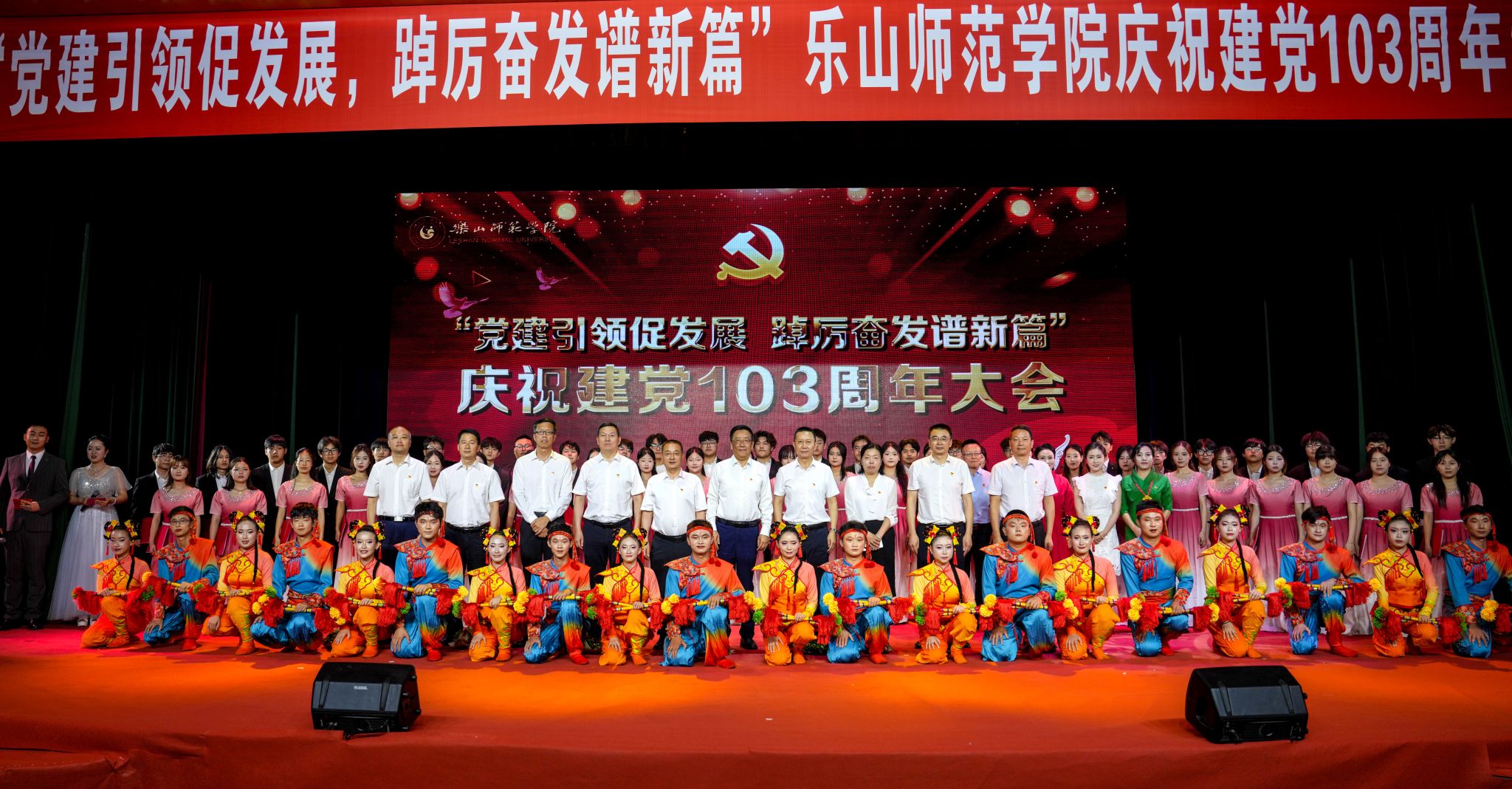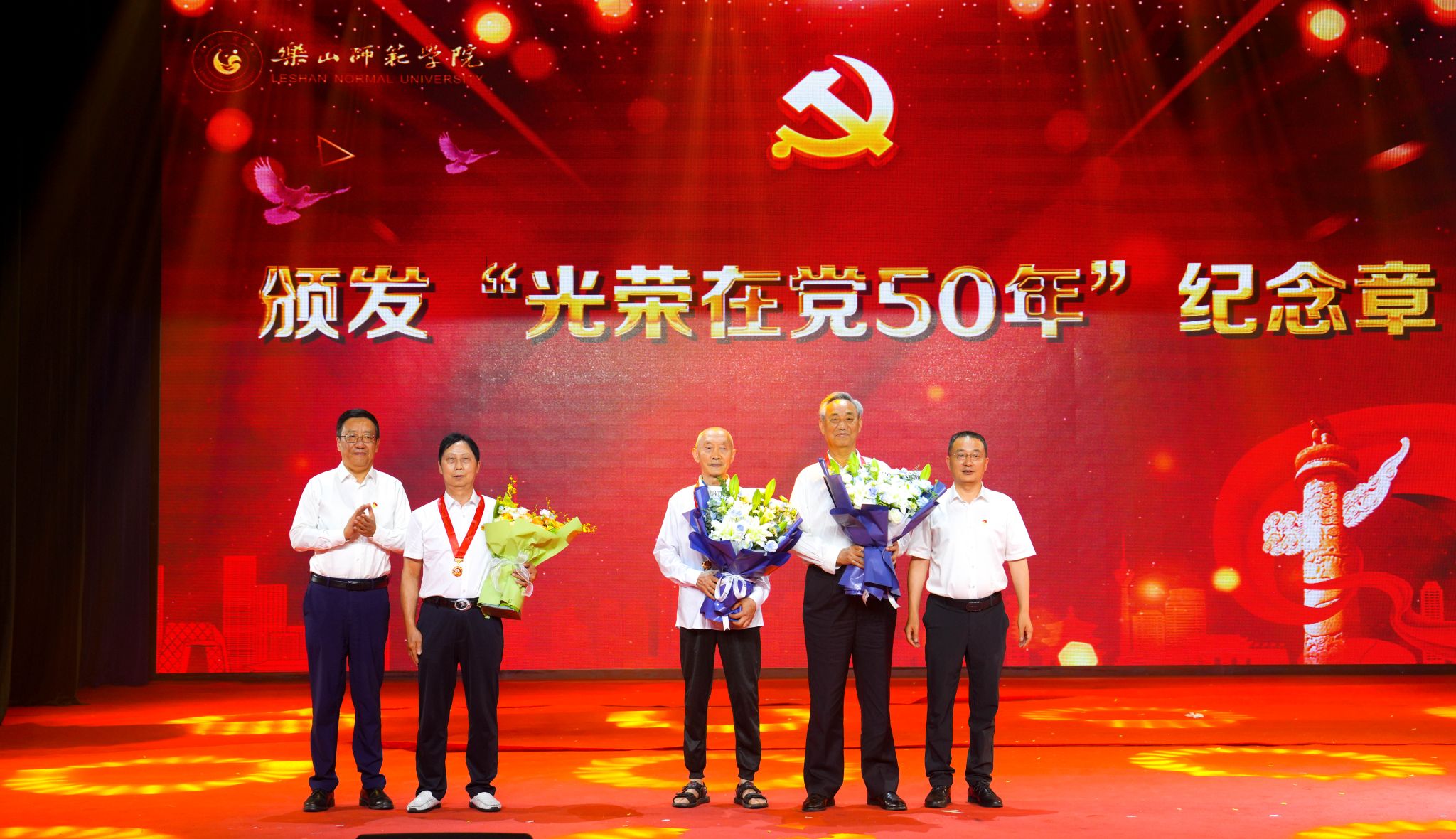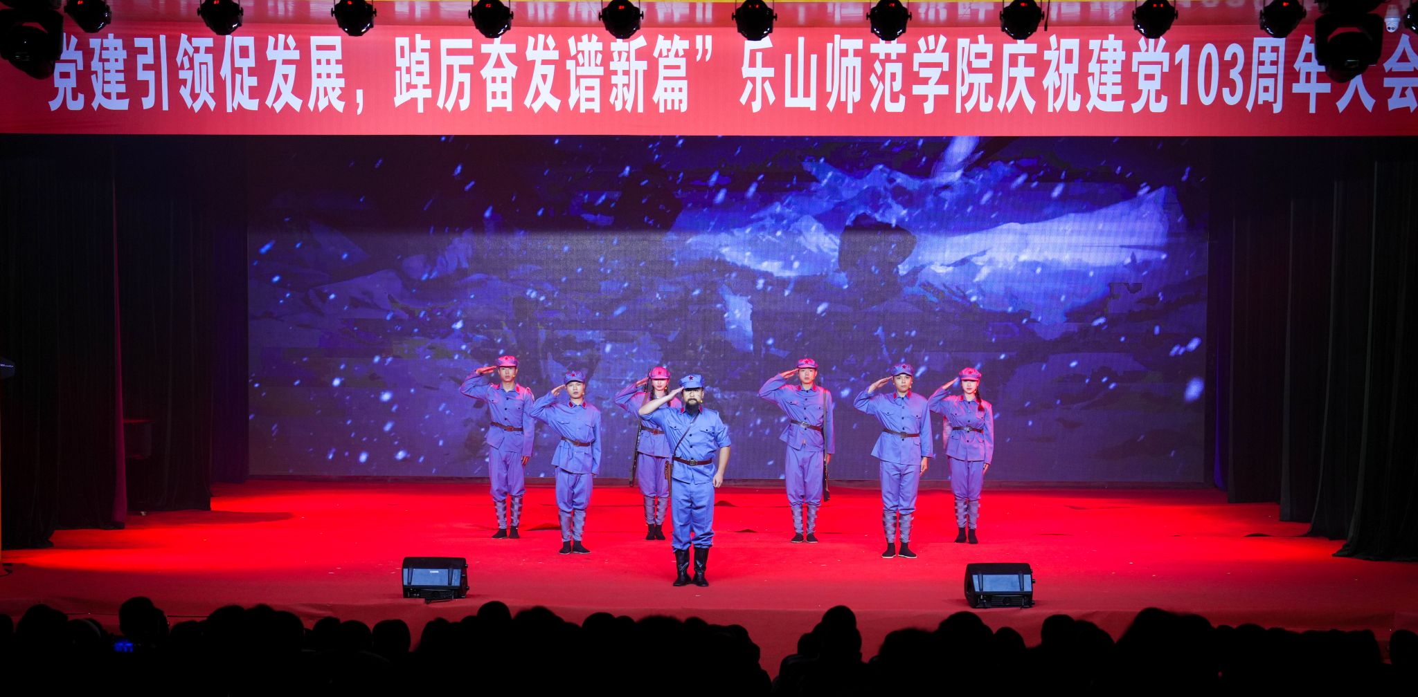 庆祝大会上,获得“光荣在党50年”纪念章的老党员周野带领新党员入党宣誓,全体参会党员重温了入党誓词。全体党员观看了2024年四川省党建工作重点任务成果展示——《青年党员说》展播。音乐学院师生讲述了红色音乐故事《英雄赞歌》,带领我们共同追忆抗美援朝期间的英雄事迹,将艺术元素与思政元素有机融合,为参会师生呈现了一场视觉盛宴和思政盛宴;马克思主义学院微党课《李拔》,展示了我校深入开展党纪学习教育,在抓严警示教育,强化以案促学见实效方面的成果;获得全国第七届大学生艺术展演舞蹈组一等奖、优秀创作奖,由30余名阳光又自信的特殊教育学院学生演绎的舞蹈《海棠花开一路红》,展现了我校在特殊教育人才培养,美育教育工作中的丰硕成果;文学与新闻学院学生配乐朗诵《丰碑》,指引着我们不忘初心,砥砺前行。最后,音乐学院师生带领全体参会党员高声齐唱《没有共产党就没有新中国》《唱支山歌给党听》《追寻》,将整场庆祝大会推向了高潮,并圆满闭幕。