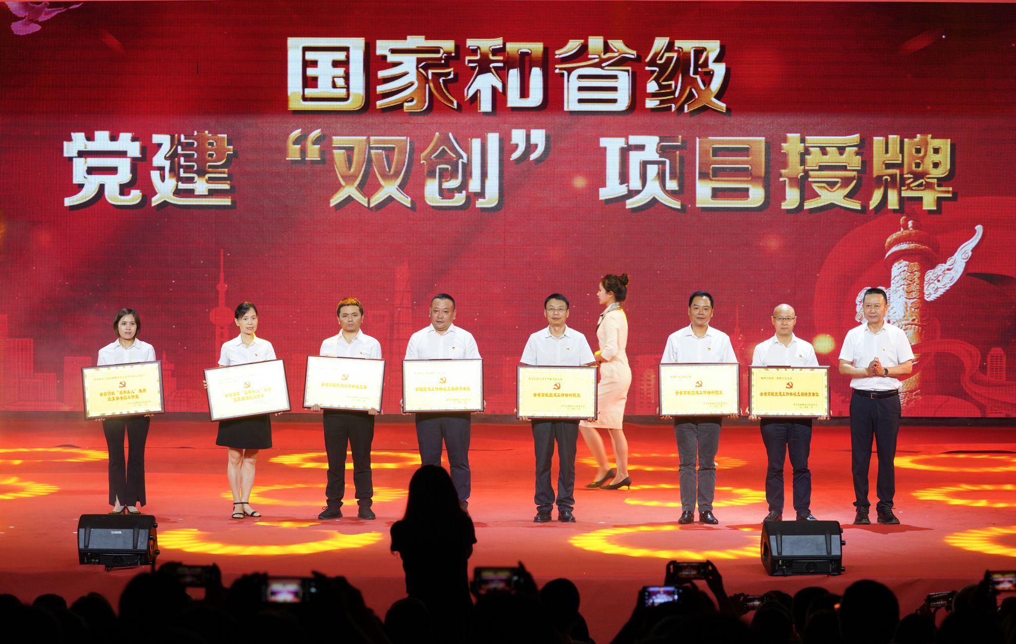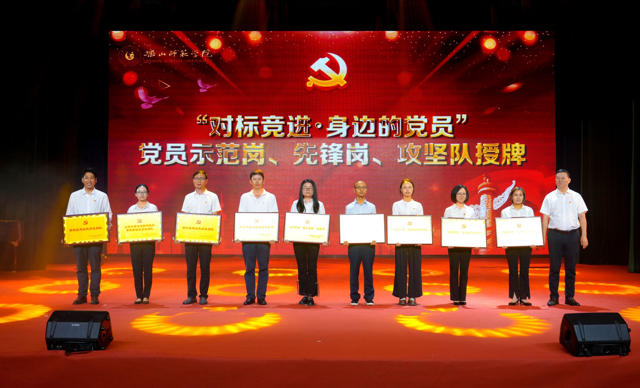 学校党委副书记、纪委书记彭尚源为“对标竞进•身边的党员”党员示范岗、先锋岗、攻坚队代表授牌。学校党委副书记、工会主席陈立志为国家级和省级党建“双创”项目授牌。胡丹、刘进为党龄50年的老党员颁发了“光荣在党50年”纪念章。