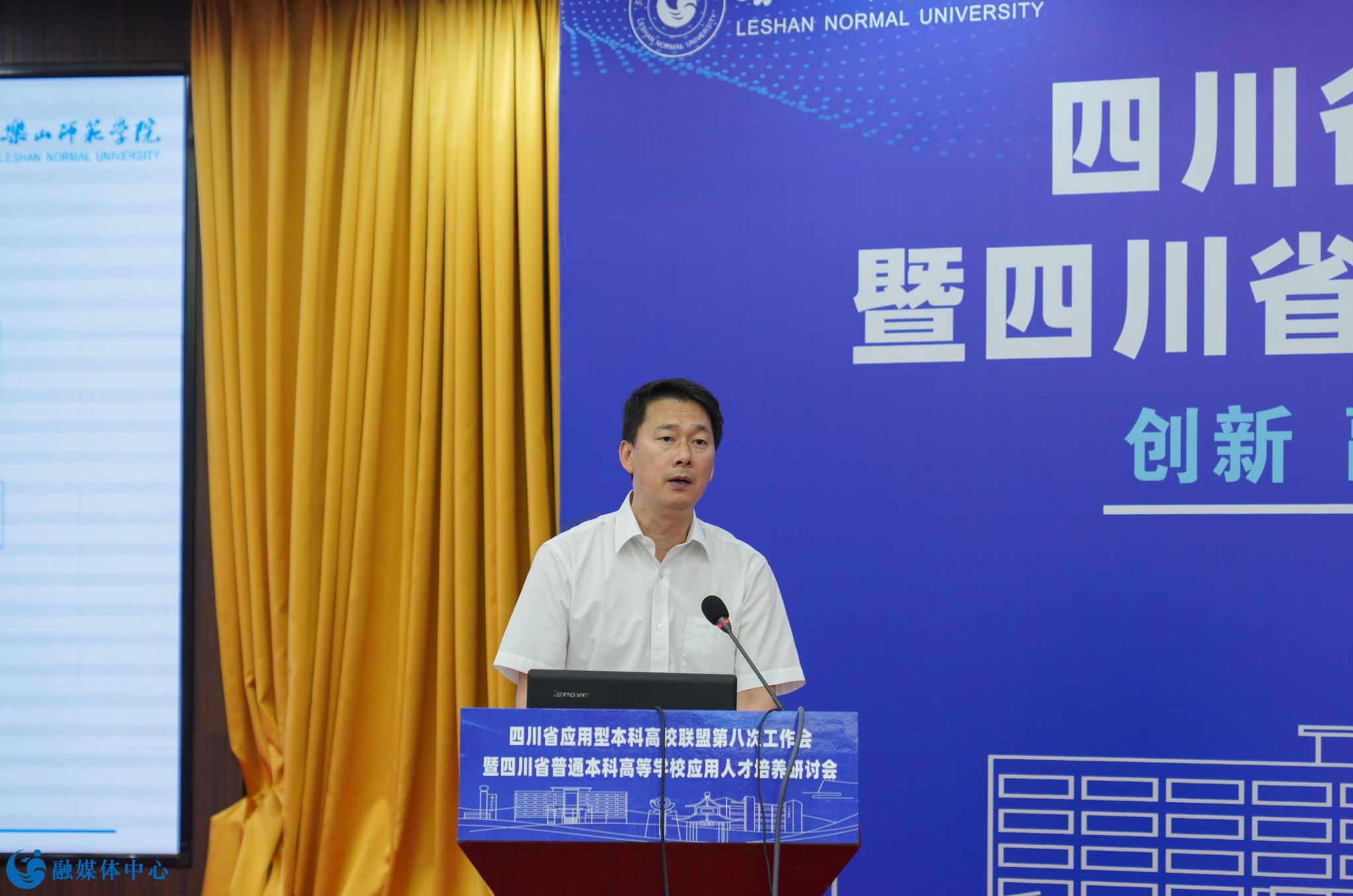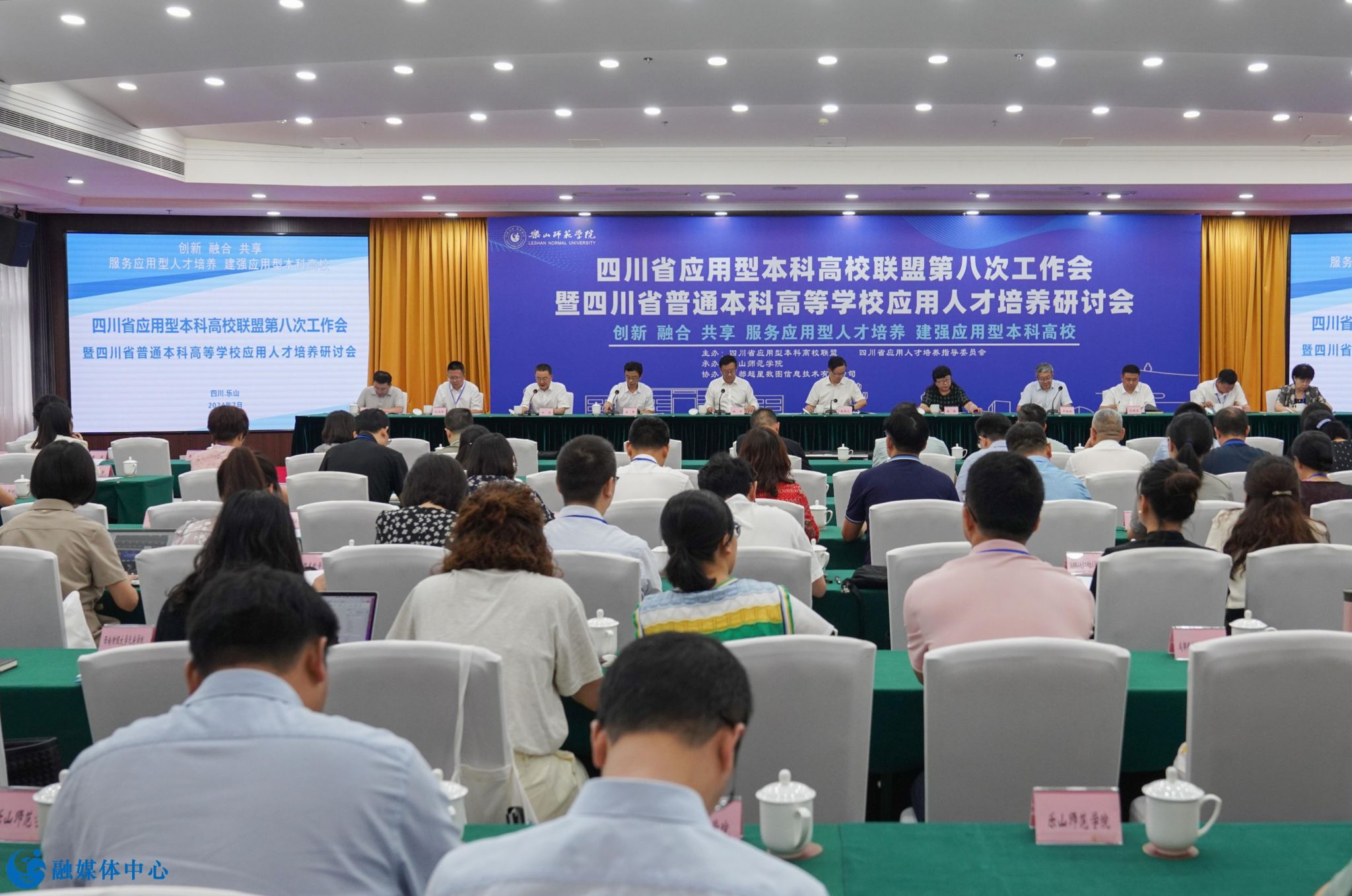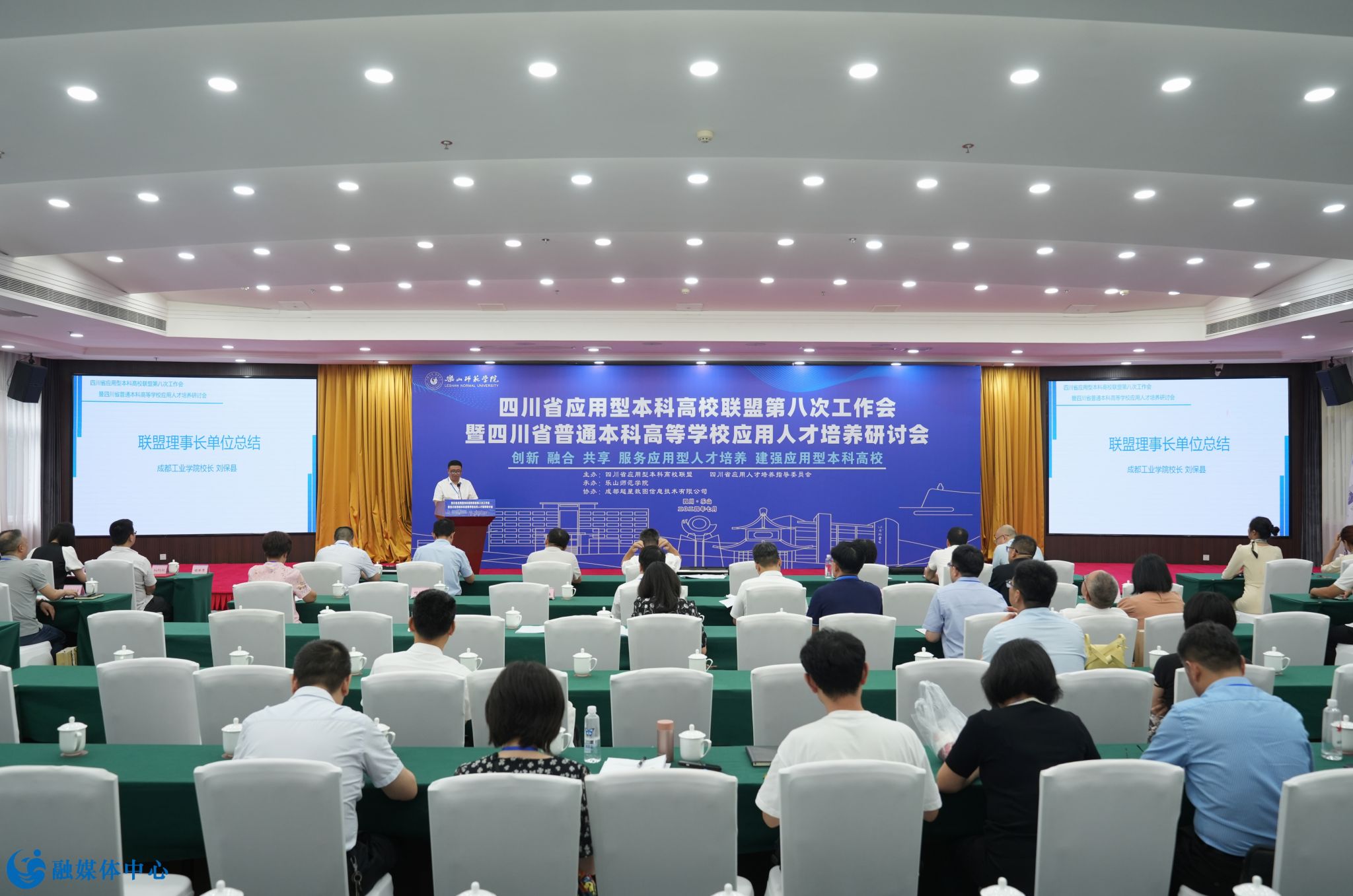 本网讯(文/刘颖 图/邹林雨)7月4日至6日,由乐山师范学院承办的四川省应用型本科高校联盟第八次工作会暨四川省普通本科高等学校应用人才培养研讨会顺利召开。四川省委教育工委副书记、教育厅党组成员陈朝先,成都工业学院正校级领导、四川省应用型本科高校联盟理事长单位代表、应用人才培养委员会主任委员严余松,四川省高等教育学会副会长、四川工程职业技术大学校长肖峰,成都工业学院党委副书记、校长刘保县,阿坝师范学院党委副书记、校长向武,四川传媒学院校长左旭舟,成都锦城学院党委副书记、校长王亚利,西南交通大学希望学院党委书记闵光辉,四川省教育厅高等教育处副处长高波,我校党委书记胡丹,党委副书记、校长刘进以及来自省内43所高校和相关单位的170名代表出席本次会议。会议开幕式由乐山师范学院党委副书记、校长刘进主持。
