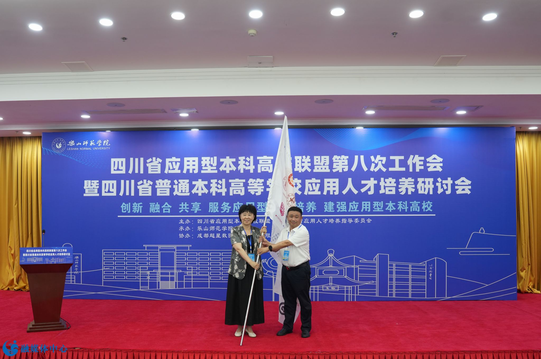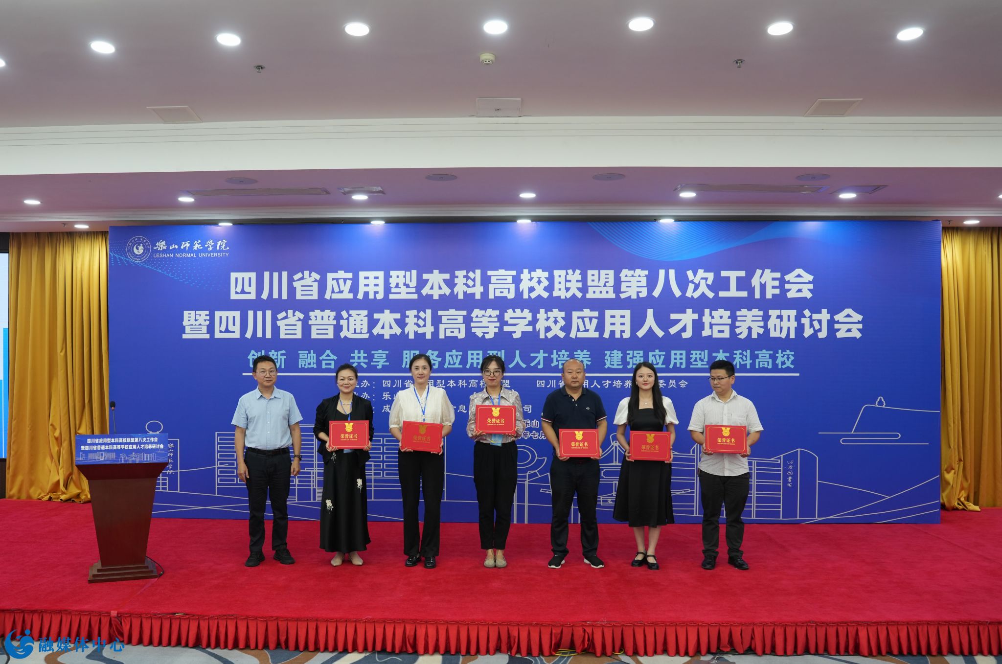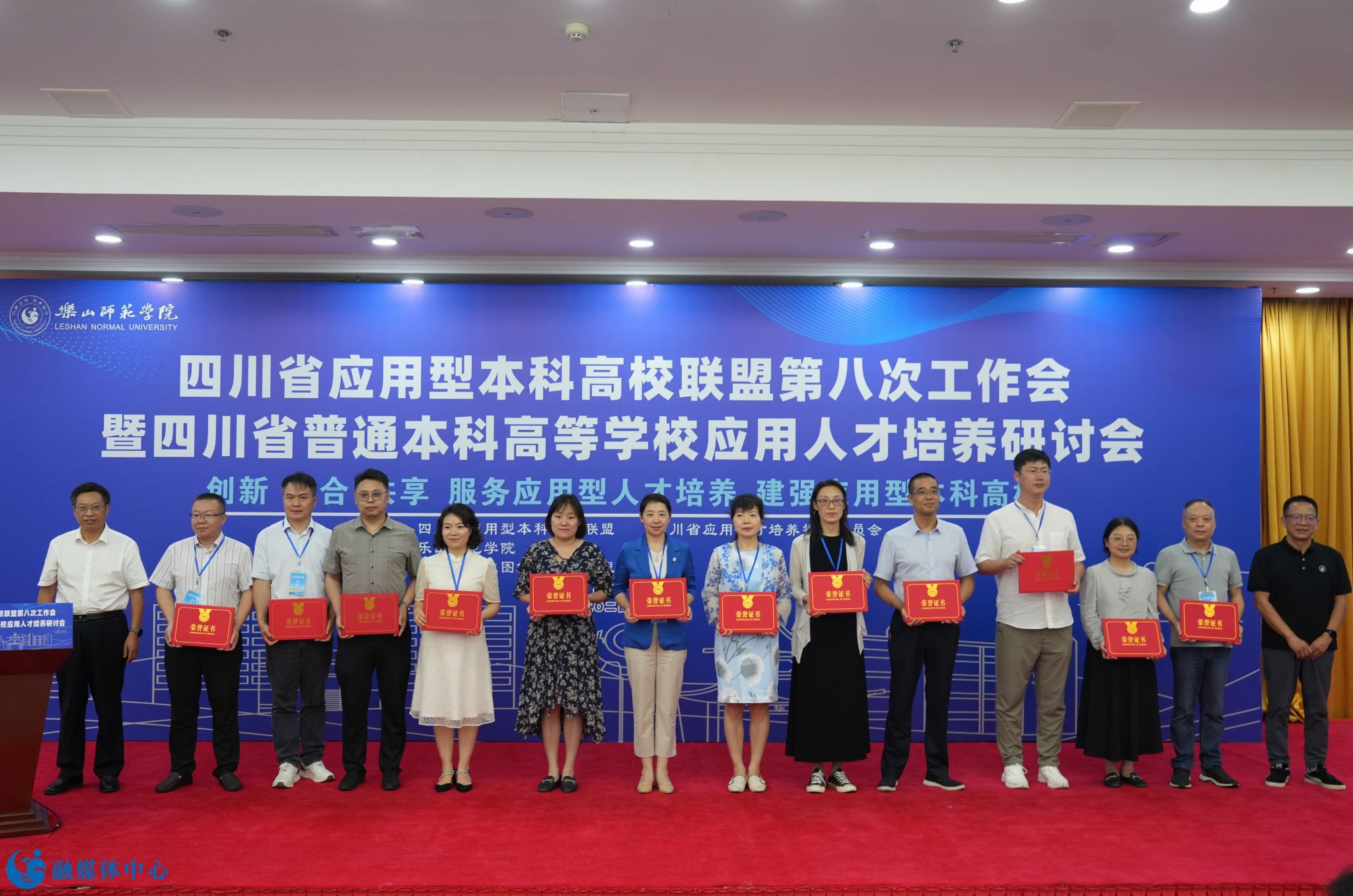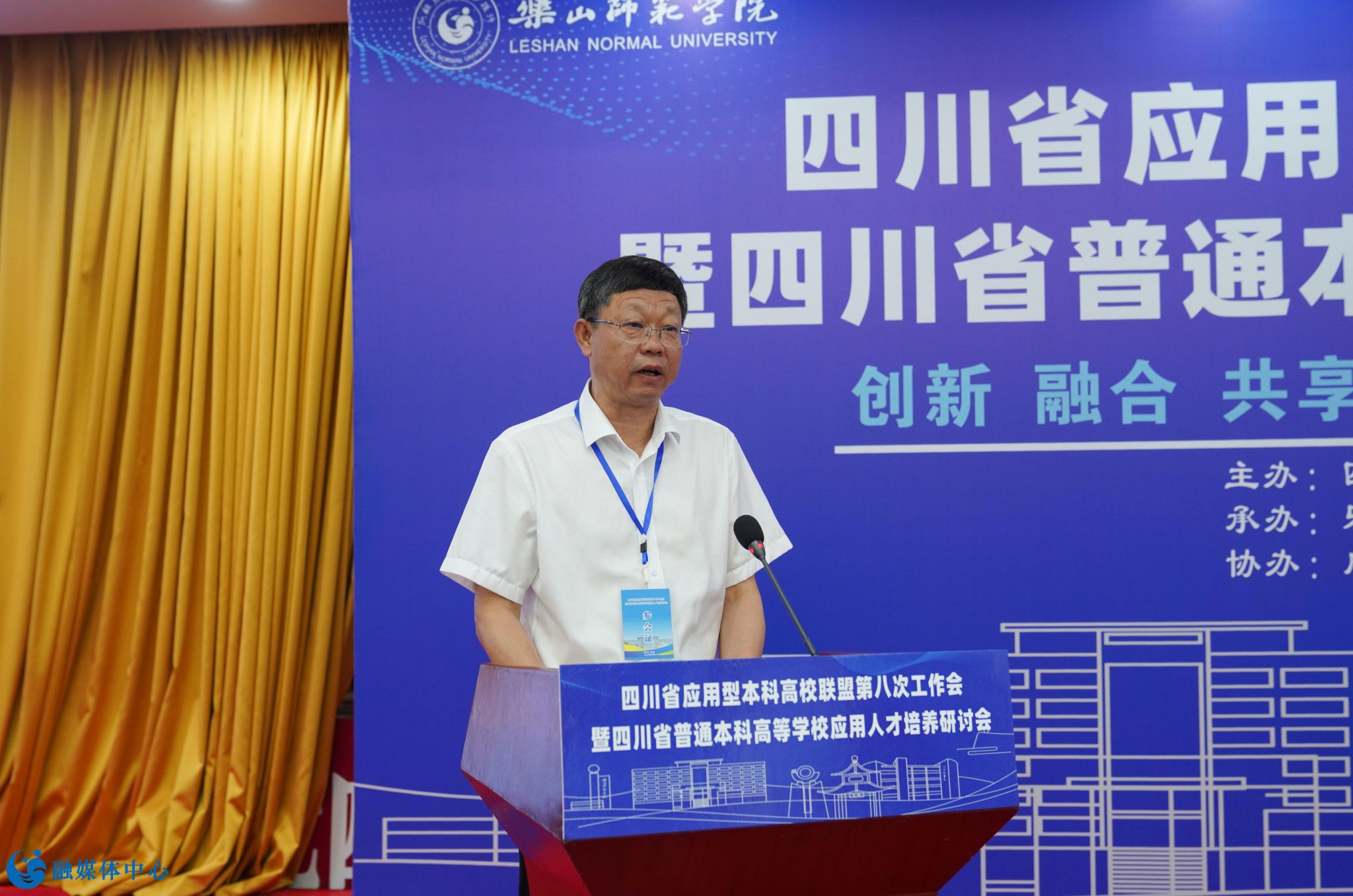 本网讯(文/刘颖 图/邹林雨)7月4日至6日,由乐山师范学院承办的四川省应用型本科高校联盟第八次工作会暨四川省普通本科高等学校应用人才培养研讨会顺利召开。四川省委教育工委副书记、教育厅党组成员陈朝先,成都工业学院正校级领导、四川省应用型本科高校联盟理事长单位代表、应用人才培养委员会主任委员严余松,四川省高等教育学会副会长、四川工程职业技术大学校长肖峰,成都工业学院党委副书记、校长刘保县,阿坝师范学院党委副书记、校长向武,四川传媒学院校长左旭舟,成都锦城学院党委副书记、校长王亚利,西南交通大学希望学院党委书记闵光辉,四川省教育厅高等教育处副处长高波,我校党委书记胡丹,党委副书记、校长刘进以及来自省内43所高校和相关单位的170名代表出席本次会议。会议开幕式由乐山师范学院党委副书记、校长刘进主持。