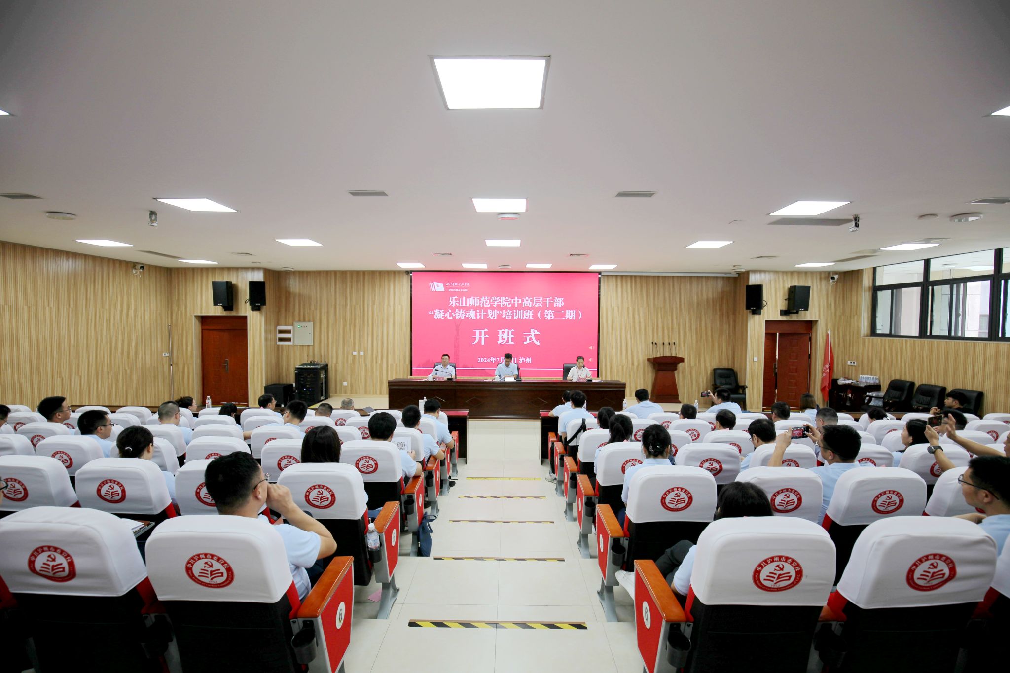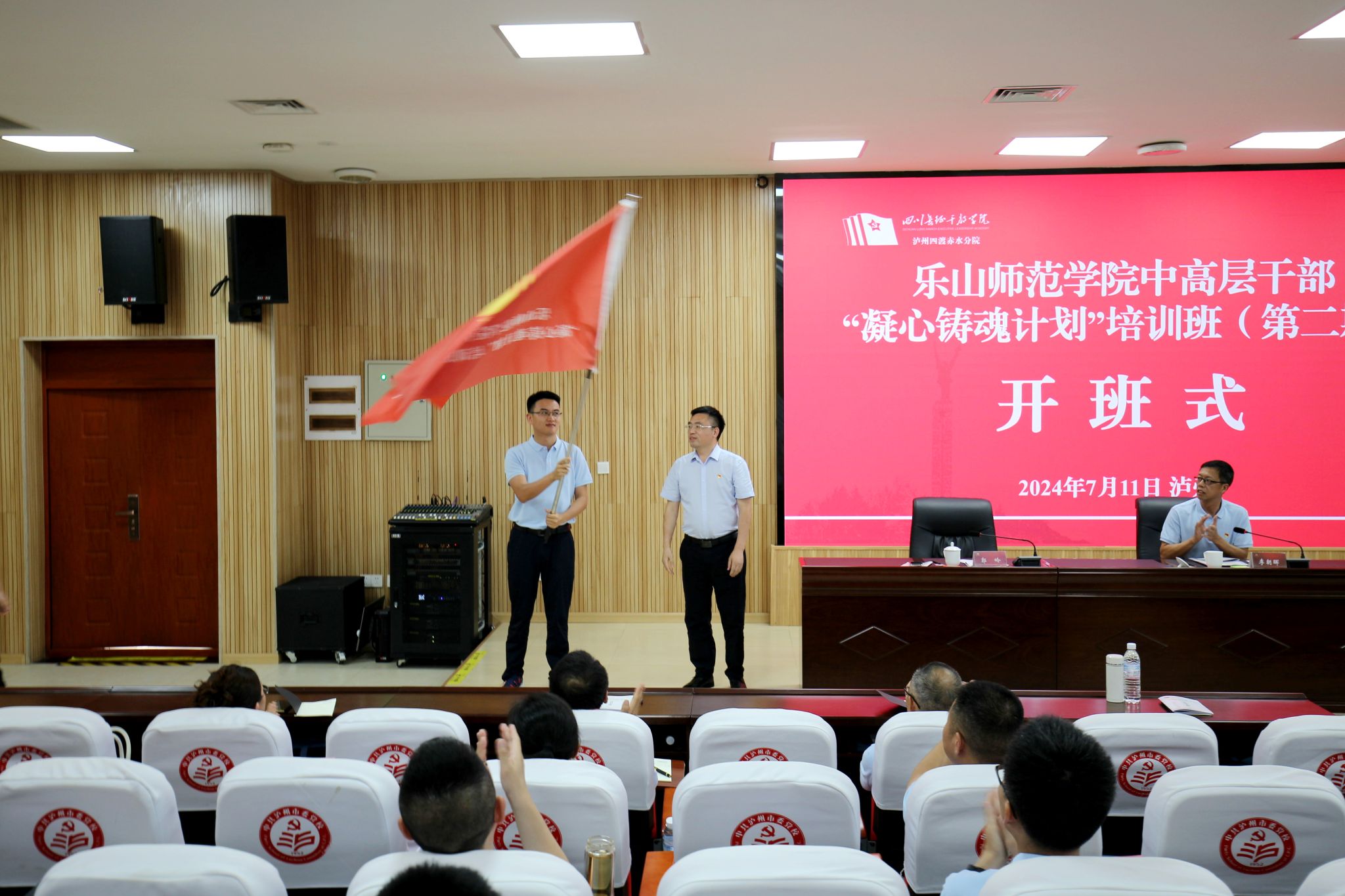本网讯(文/唐书怡 图/梁晨)为深入学习贯彻党的二十大精神和习近平新时代中国特色社会主义思想,7月11日下午,我校干部“凝心铸魂计划”培训班(第二期)在四川长征干部学院泸州四渡赤水分院开班。泸州市委党校副校长郭岭,我校党委常委、副校长李朝晖出席开班仪式。仪式由泸州四渡赤水分院教师龙雪梅主持。