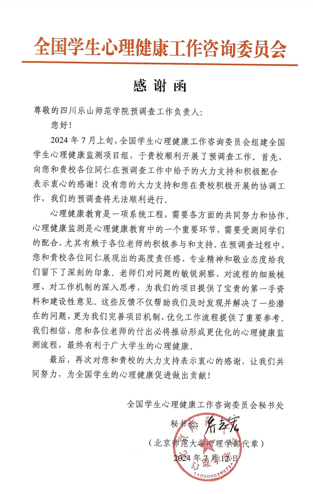 7月3日开始,我校专门制定了详细的学校预调查工作方案,召开辅导员会议部署相关工作,参与北师大组织的预调查工作培训。7月9日-10日,在心理健康教育中心的组织和各学院的配合下顺利完成了心理健康监测线下测评和访谈回访工作,并为项目组在流程梳理、题项问题、工作机制等方面提供了反馈意见。为此,全国学生心理健康工作咨询委员会特别向我校发来感谢函,感谢我校的大力支持。(审核人:陶媛)