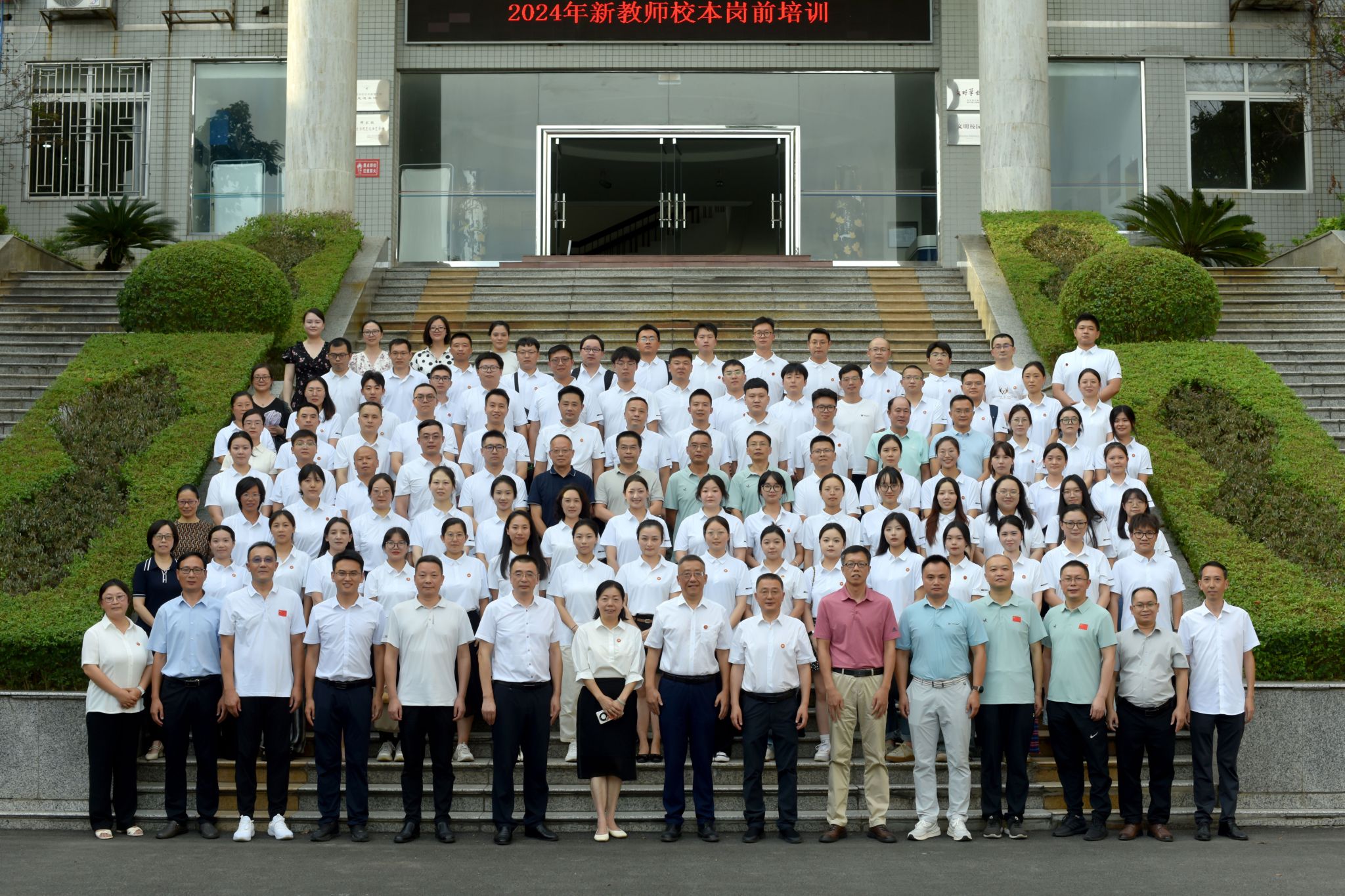 讲座结束后,学校领导及全体新教师在弘毅楼前合影留念。本次岗前培训为期三天半,学校各职能部门负责人、教授将为新老师带来全方位的培训,新教师还将前往“中国两弹城”进行校外拓展。开班典礼上,党委教师工作部(人事部)部长、教师发展中心主任黄凯介绍了本次新教师校本岗前培训安排以及培训期间的纪律要求。文学与新闻学院韩雪飞博士代表新教师发言,表示将树立正确教育理念,努力提升教学科研能力,为学校发展贡献力量。