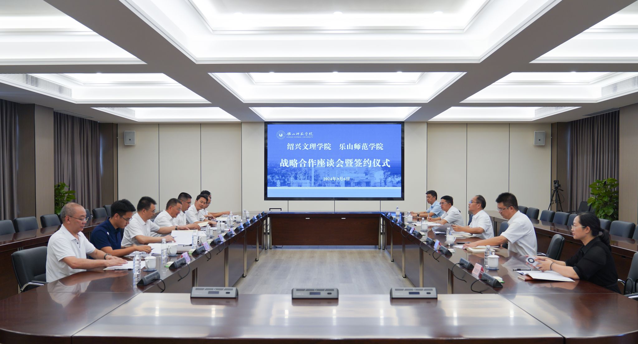本网讯(文图/孟繁增)9月6日,绍兴文理学院党委副书记、校长赵阳,党委常委、副校长陈均土带队来我校交流调研,并与我校签订新一轮战略合作协议。乐山市市政府副秘书长、浙川东西部协作乐山工作队队长钱旦阳,学校党委书记胡丹,党委副书记、校长刘进,党委常委、副校长李方裕、汪天飞参加。