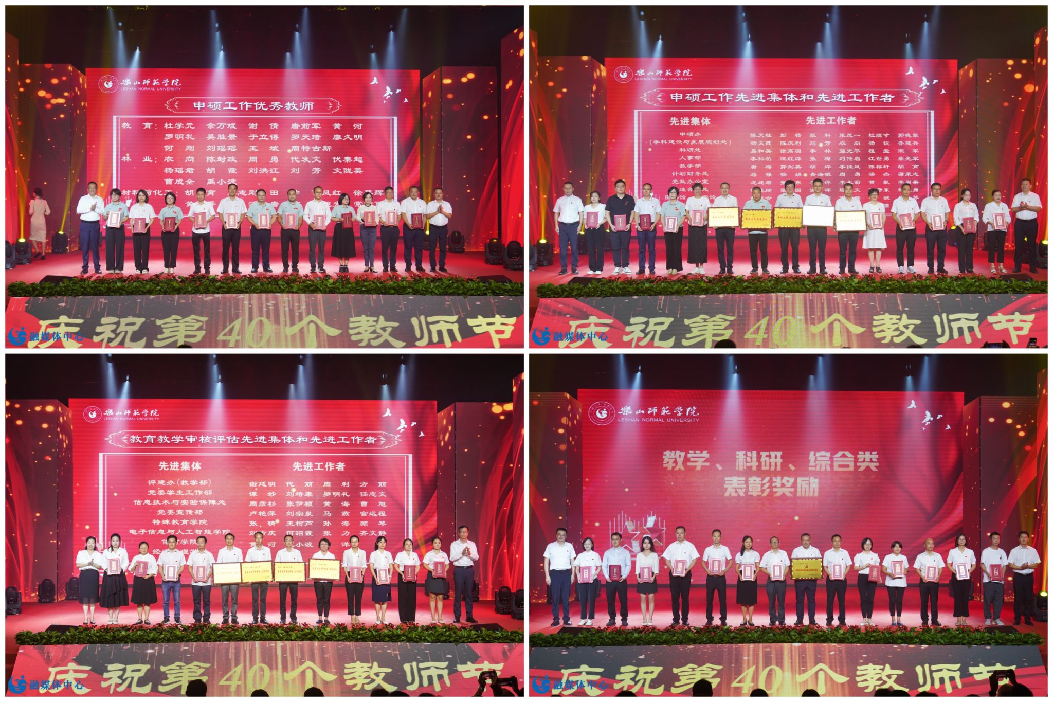 本网讯(文图/孟繁增)“春风化雨育桃李,润物无声展芳华”。9月10日,乐山师范学院庆祝第40个教师节表彰大会在实训楼多功能厅举行。校领导胡丹、刘进、陈立志、彭尚源、陈范华、李朝晖、李方裕、汪天飞出席会议。
