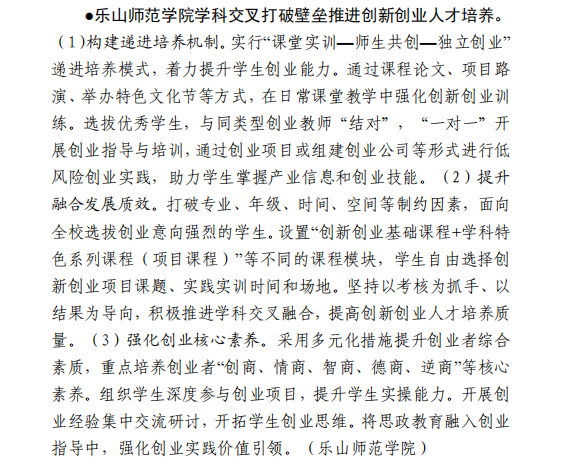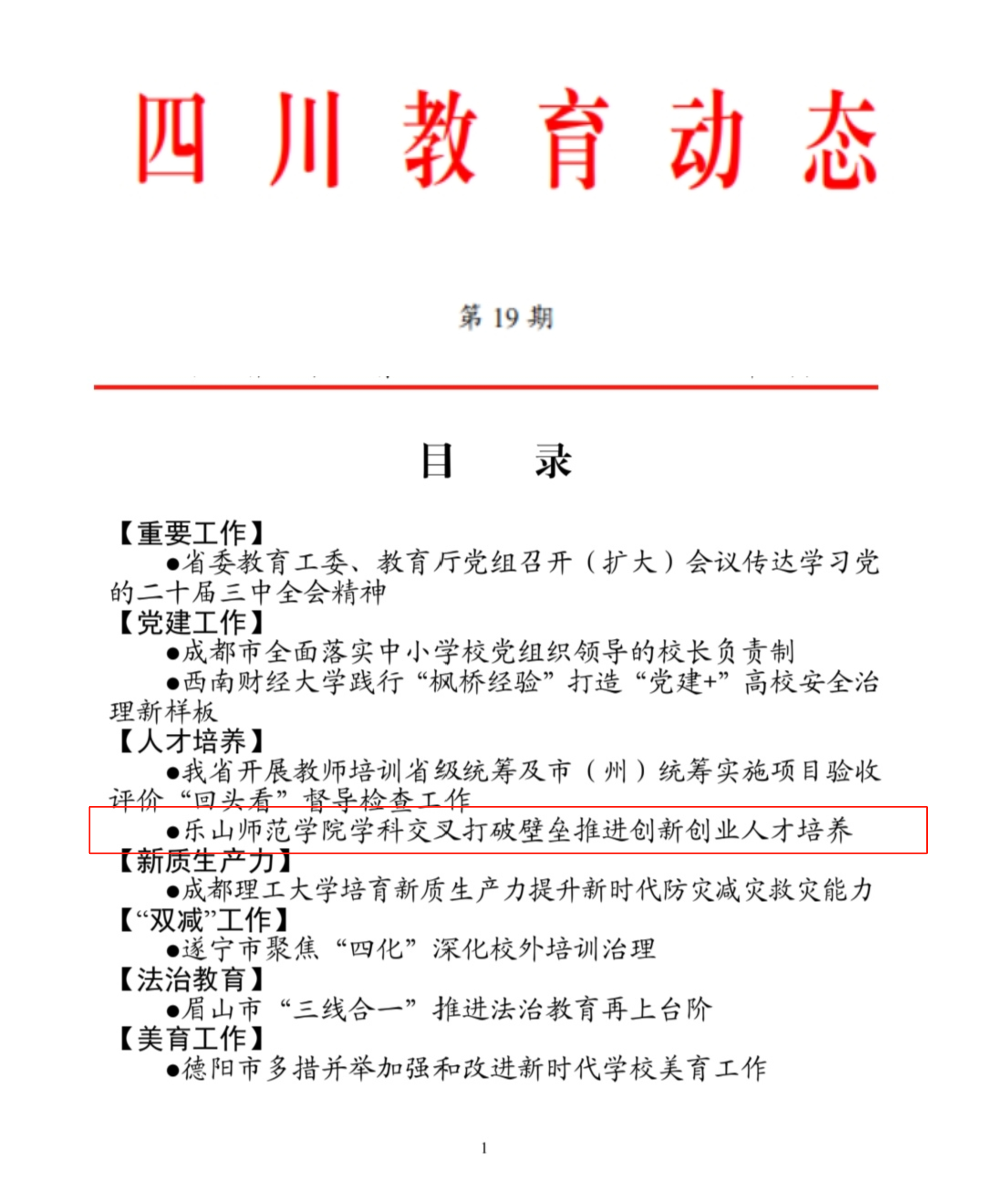 本网讯(文图/张伊颖)四川省委教育工作委员会、四川省教育厅主办的《四川教育动态》2024年19期,以《乐山师范学院学科交叉打破壁垒推进创新创业人才培养》为题,专题报道了我校积极加强创新创业人才培养的具体举措。