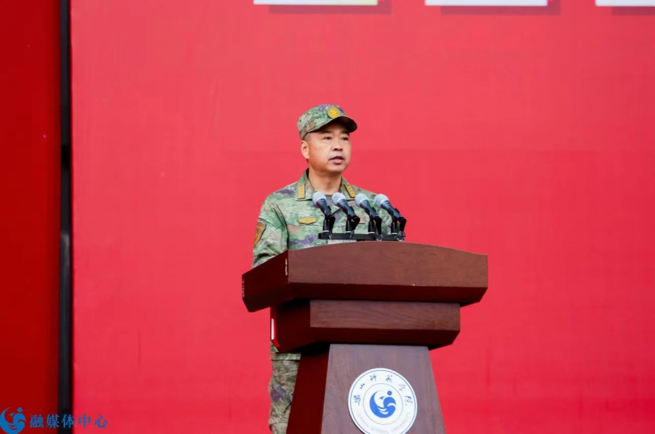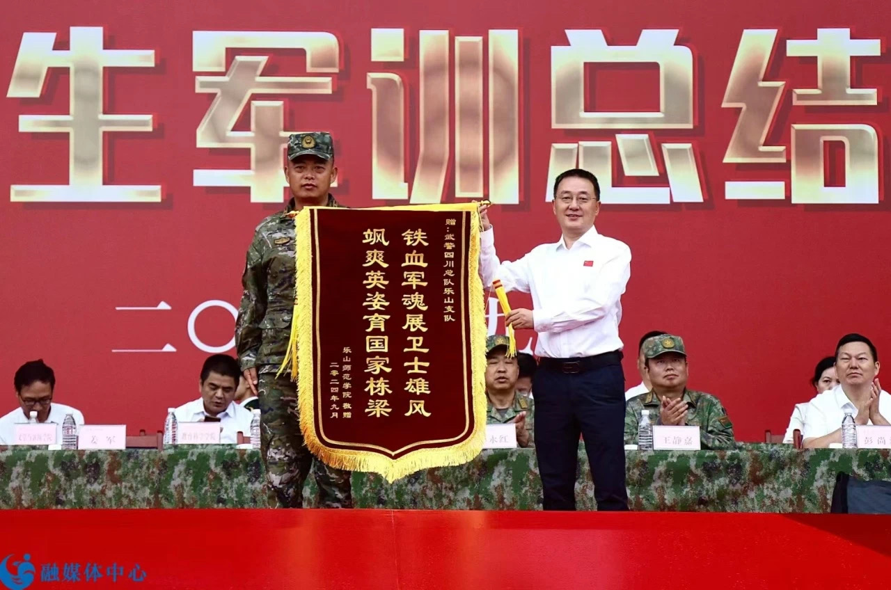 汪天飞在军训总结中向长期以来支持我校国防教育工作的乐山军分区、武警乐山支队、市中区人民武装部表示感谢,向圆满完成本次军训任务的同学们表示祝贺。他指出,今年,学校主动适应高校国防教育新形势新政策新要求,在总结以往军训工作经验的基础上,进一步规范和加强军训育人工作,狠抓全员参与、狠抓军民融合、狠抓按纲施训、狠抓风险管控,积极探索构建军民一体、校内协同、富有成效的军训育人体系,有效增强了学生国防观念、忧患意识和国防素养,圆满完成军训目标任务。他希望,同学们要发扬优良传统,拓展军训成果;要提升学习能力,擦亮青春底色;要心怀爱国之情,践行报国之志,努力成长为堪当民族复兴重任的时代新人。