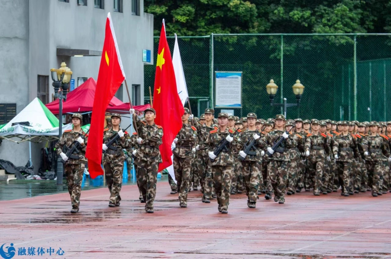 护旗手护送党旗、国旗而来,一声令下,分列式开始,2024级新生学员无惧风雨,正步走来,英姿飒爽,步履铿锵,尽显乐师学子风采。