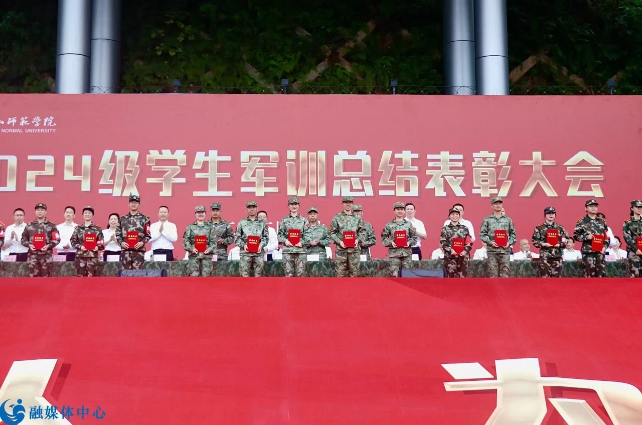 陈立志宣读了2024级学生军训工作表彰文件。主席台就座的领导为获奖代表颁奖。