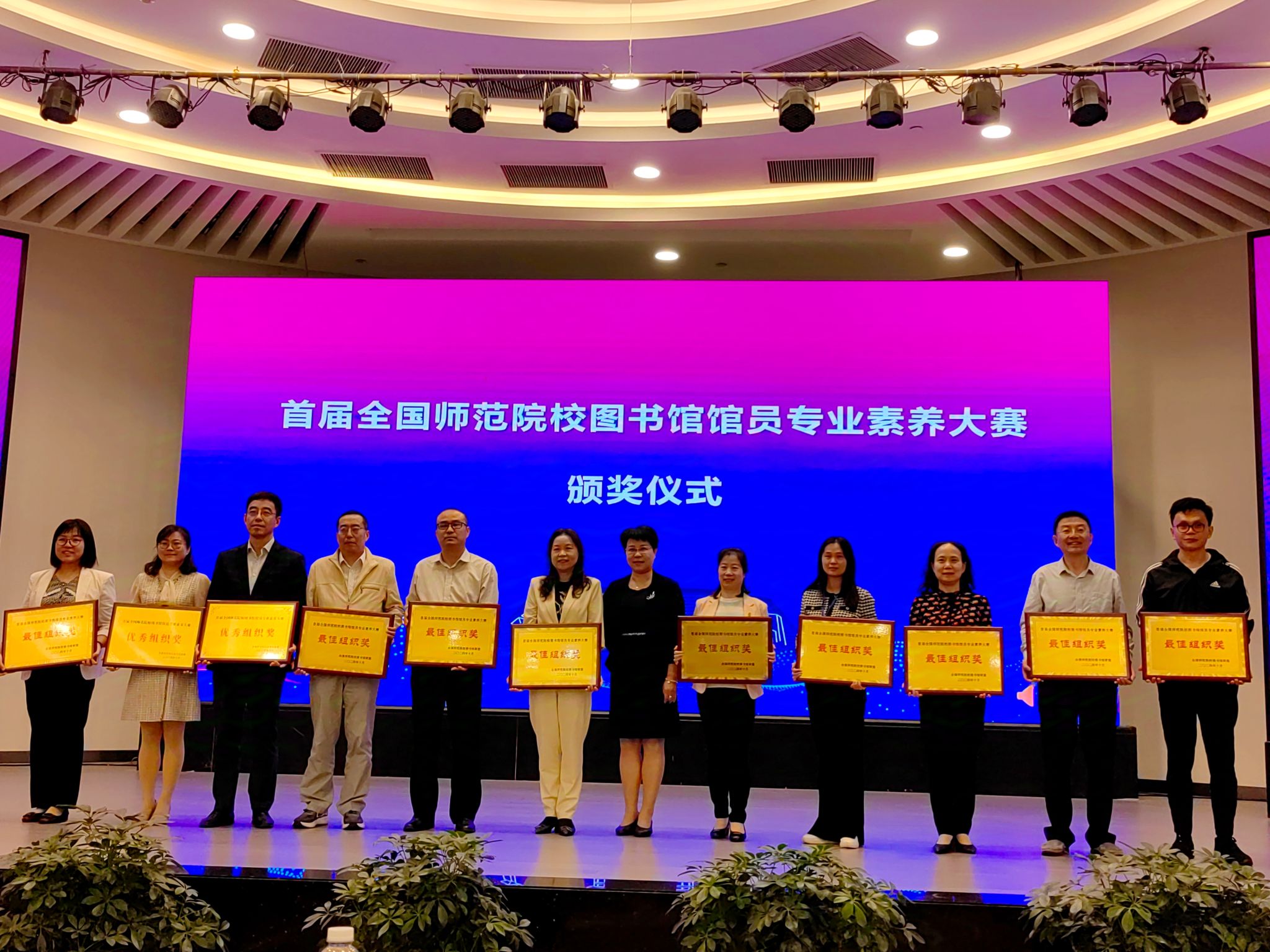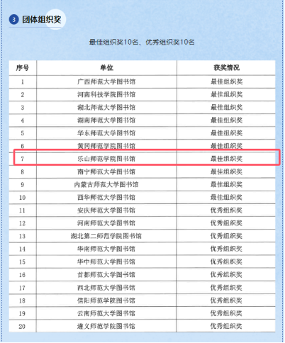 本网讯(文图/蔡小筱)10月17日,全国师范院校图书馆联盟公布了首届全国师范院校图书馆馆员专业素养大赛获奖名单,我校图书馆在参赛的52所师范院校中,在所有比赛单元均获佳绩。我校图书馆馆员获得线上专业知识答题2个一等奖、4个二等奖、4个三等奖,微课展示获得1个二等奖、2个三等奖,图书馆荣获最佳组织奖,全国仅有10个单位获此殊荣。10月25日,组委会在桂林举行了隆重的颁奖仪式。