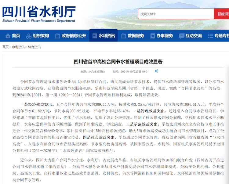 自2019年9月30日开始,五年内共节水约 309.11万吨,节约水费 1004.61万元,平均节水率达55.43%。学校建成智能节水监控平台、优化供水系统,实现表计分级管理并绘制校园供水管网分布图,用水管水水平不断提升。学校先后两次在全省高校节水工作推进会上交流发言、分享经验,累计接待省内外15所高校来访交流,助力5所高校成功实施合同节水管理项目。学校成功创建为四川省首批省级“节水型高校”,入选水利部合同节水管理典型案例、节水型高校典型案例,荣获全国公共机构(2024-2026年)“水效领跑者”国家级荣誉称号。