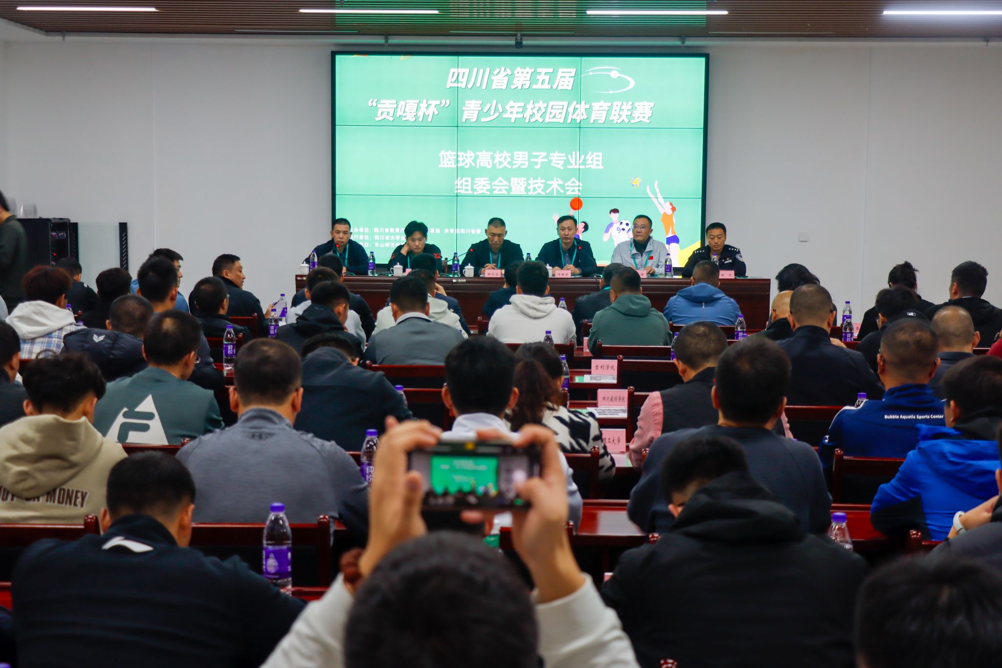 本网讯(文图/融媒体中心)11月8日,由四川省教育厅、四川省体育局、共青团四川省委主办,四川省大学生体育协会执行,乐山师范学院承办的四川省第五届“贡嘎杯”青少年校园体育联赛(高校篮球男子专业组)组委会暨技术会在乐山举行。四川省体教融合办公室副处级干部许世东;四川省大学生体育协会会长杨远波;乐山师范学院体育学院院长张峰;乐山市市中区苏稽派出所副所长谢凯;全体裁判员,各参赛单位领队、教练及运动员代表出席参加了会议。会议对本次赛事筹备情况进行了汇报,并对竞赛规则、安全比赛等注意事项进行了强调。