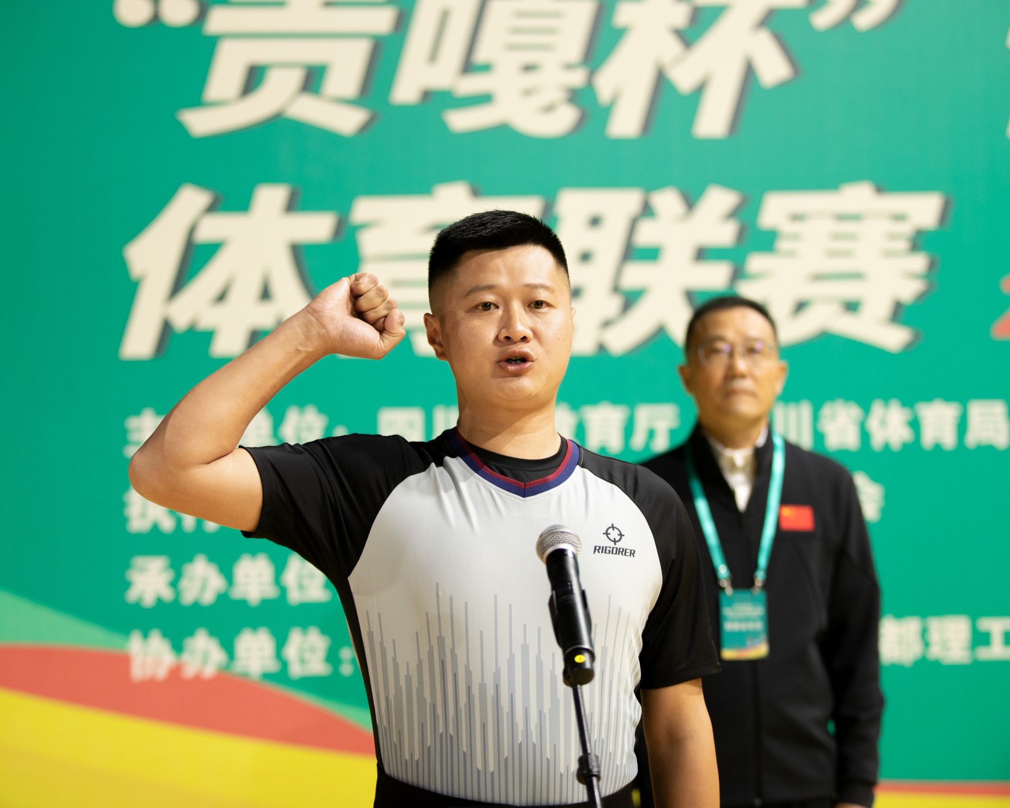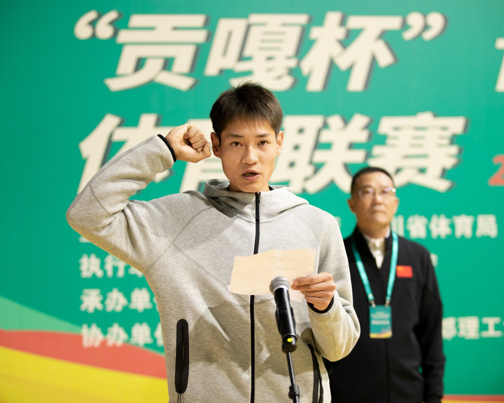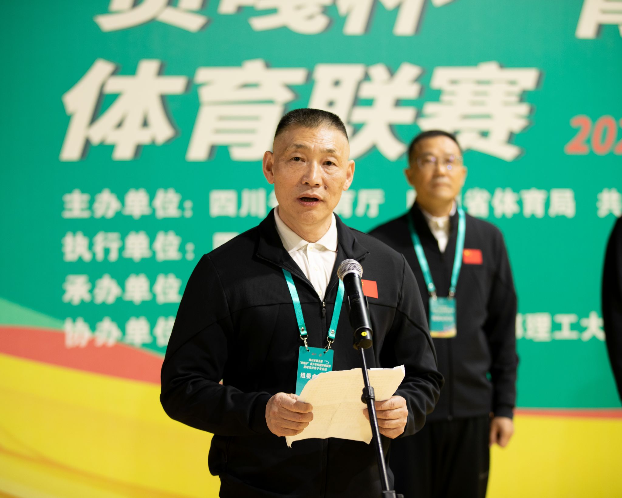 四川省大学生体育协会会长、西南财经大学体育学院名誉院长杨远波发表讲话。他指出“体育承载着国家强盛、民族振兴的梦想。”党的二十大开启了体育强国建设新征程,为进一步深化体教融合、推动高校体育高质量发展指明了方向。“贡嘎杯”赛事是我省规模最大、覆盖面最广、水平最高、号召力最强的校园体育品牌赛事,始终坚持“立德树人、竞赛育人”的发展理念,不仅为学生提供了展示体育技能的重要平台,更是提升竞技体育水平和丰富校园体育文化的有力举措。他希望,各代表队和运动员在篮球比赛中享受乐趣、增强体质、健全人格、锤炼意志,赛出风格、赛出友谊、赛出水平,展现奋勇争先、团结向上的精神风貌,在篮球竞技场上留下你们追逐荣耀与梦想的宝贵身影,勇攀你们每个人心中的“贡嘎之巅”!