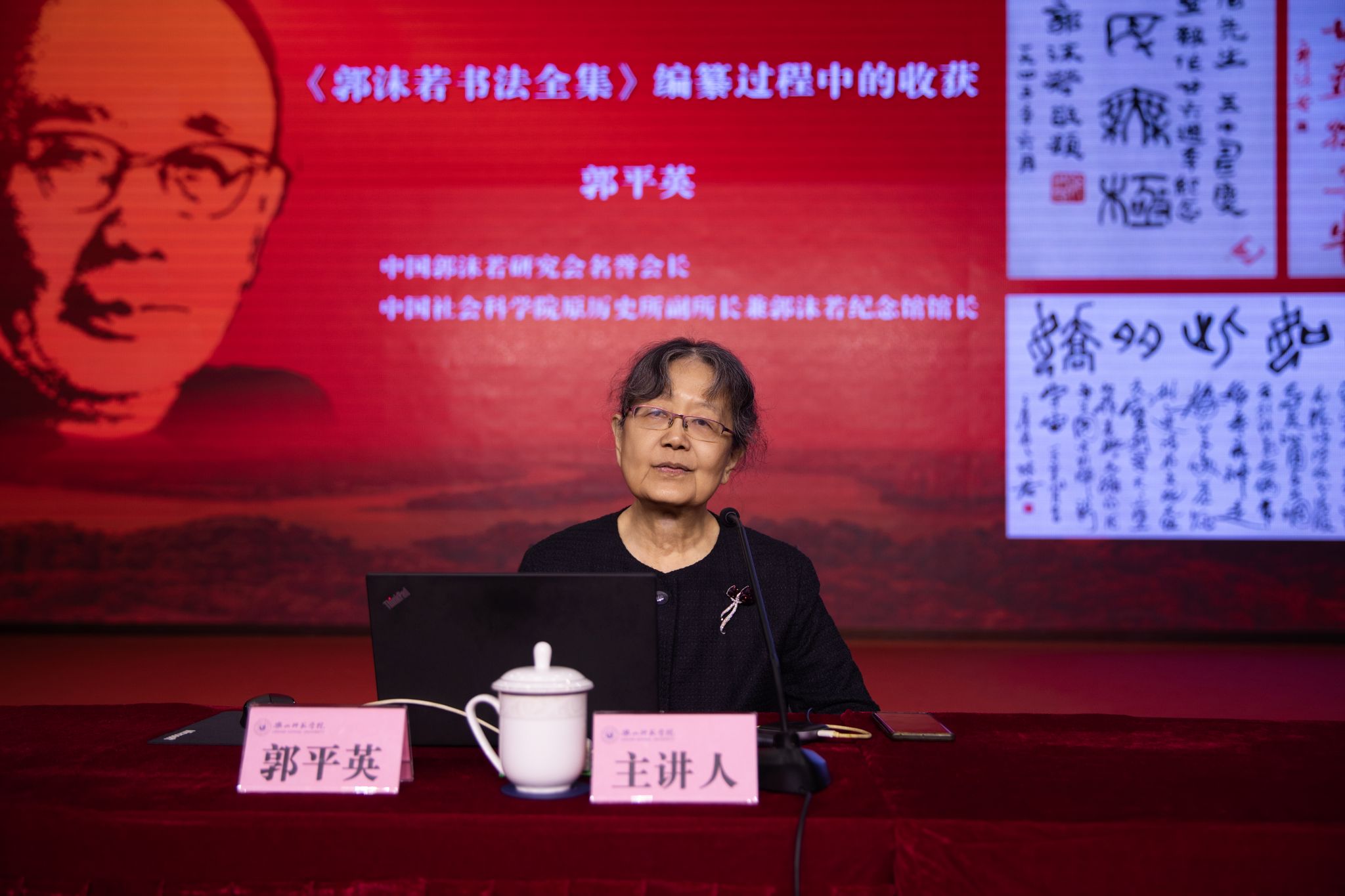 中国郭沫若研究会名誉会长、中国社会科学院原历史所副所长兼郭沫若纪念馆馆长、郭沫若女儿郭平英女士分享了她收集、整理《郭沫若书法全集》的情况,并通过郭老的部分代表性书法作品,向大家展示了郭沫若先生的精彩人生履历和学术履历。
