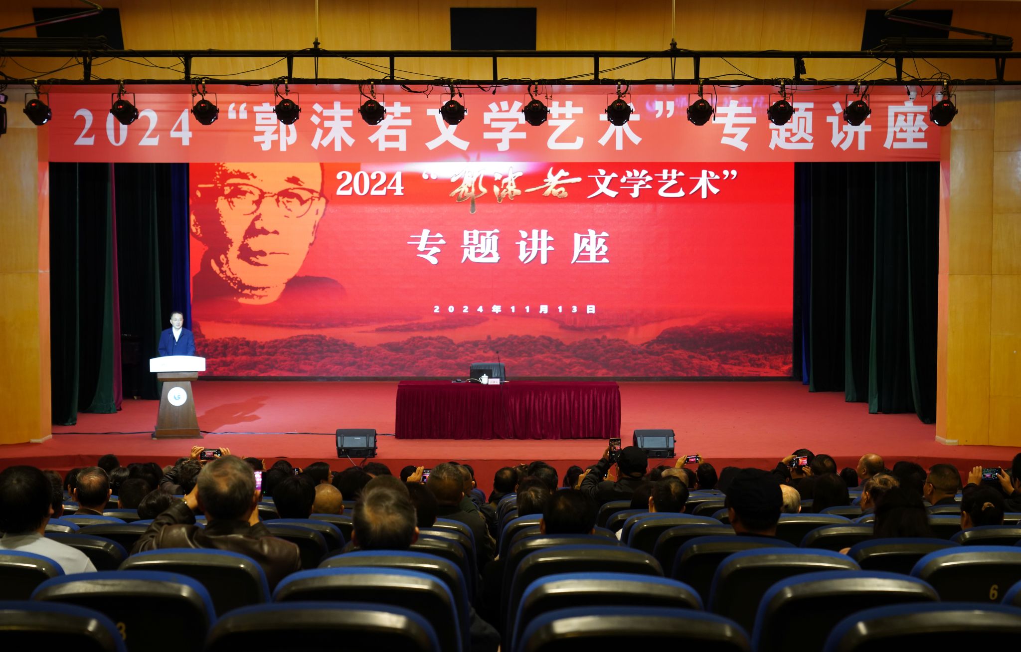 本网讯(文图/孟繁增)擦亮沫若文化名片,繁荣乐山文艺事业。在郭沫若同志诞辰132周年即将到来之际,11月13日,我校作为主要承办单位之一的“2024郭沫若文学艺术奖颁奖典礼”在沙湾区拉开帷幕。当天,作为本届颁奖典礼系列配套活动——2024“郭沫若文学艺术”专题讲座在我校实训楼多功能厅举行,郭沫若亲属代表、学界权威专家代表齐聚一堂,共同开启一场关于郭沫若文学艺术的深度探索之旅。校党委书记、校长,四川省郭沫若研究会会长刘进主持并作总结讲话。乐山市委常委、宣传部部长郭捷出席并聆听讲座。